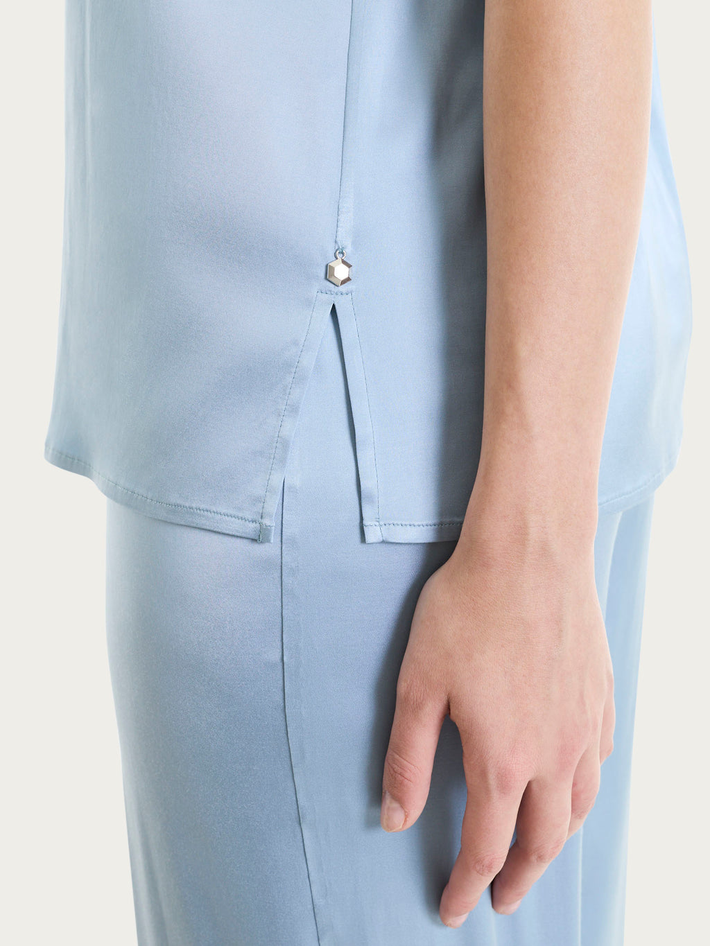 Das Kleidungsstück ist aus Stretch-Satin gefertigt, einem leichten Stoff mit weichem und angenehmem Griff und leicht glänzender Oberfläche, die dem Kleidungsstück ein gepflegtes Aussehen verleiht. Die fließende Struktur, die durch einen Stretchanteil verstärkt wird, verbessert den Tragekomfort und die Bewegungsfreiheit und sorgt gleichzeitig für einen stabilen und sauberen Sitz.