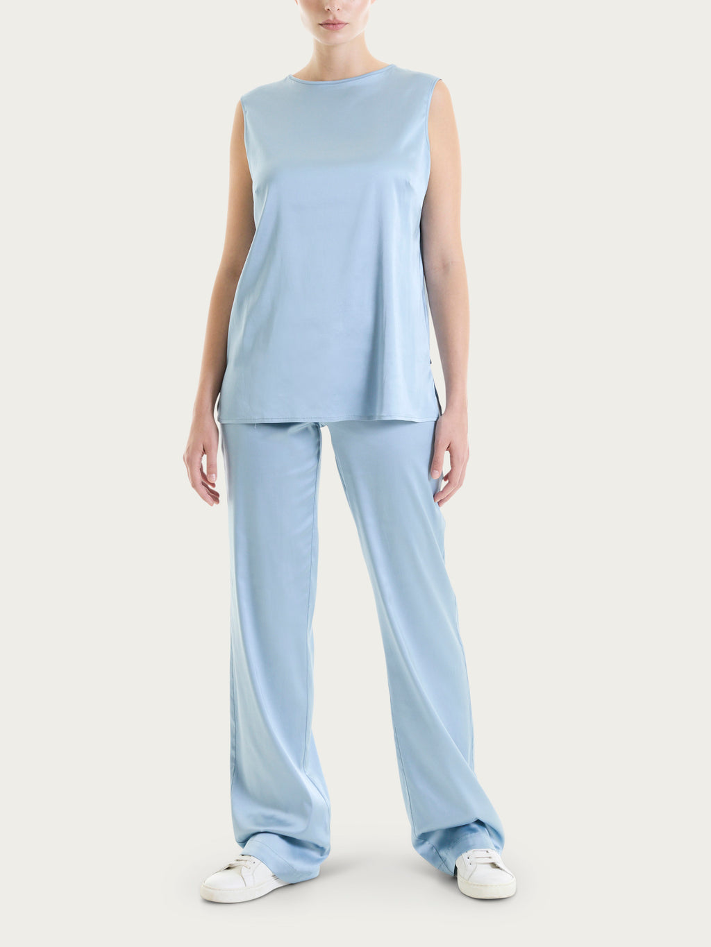 Ärmelloses Damenoberteil mit breiten Schultern aus Stretch-Satin.