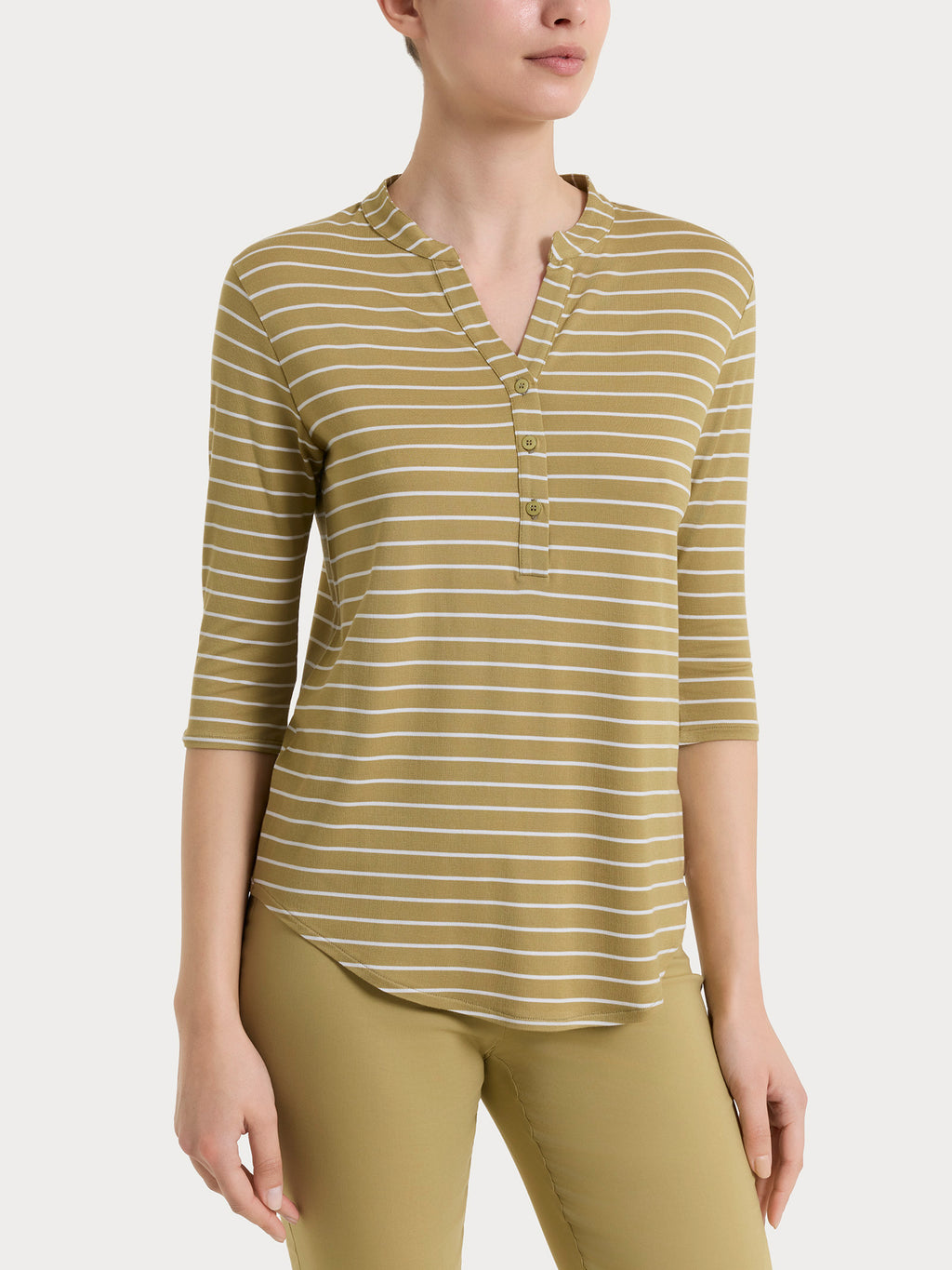 Damen-T-Shirt mit V-Ausschnitt und Serafino-Öffnung, hergestellt aus Summer Light Piquet, einer leichten und dehnbaren Viskose, die kühl und angenehm auf der Haut ist.