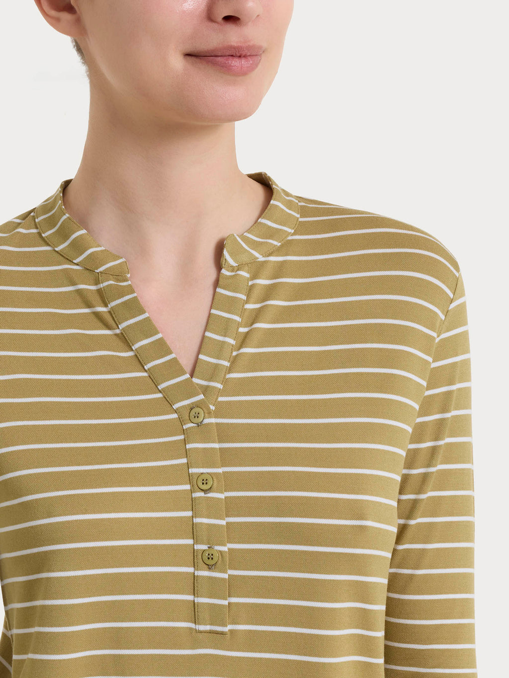 Es zeichnet sich durch ein unpaariges Streifenmuster aus, das dem Kleidungsstück ein frisches und dynamisches Aussehen verleiht, sowie durch eine weiche Passform mit einer fließenden Linie, die Komfort und Bewegungsfreiheit garantiert und sich auf natürliche Weise an verschiedene Körperformen anpasst.
