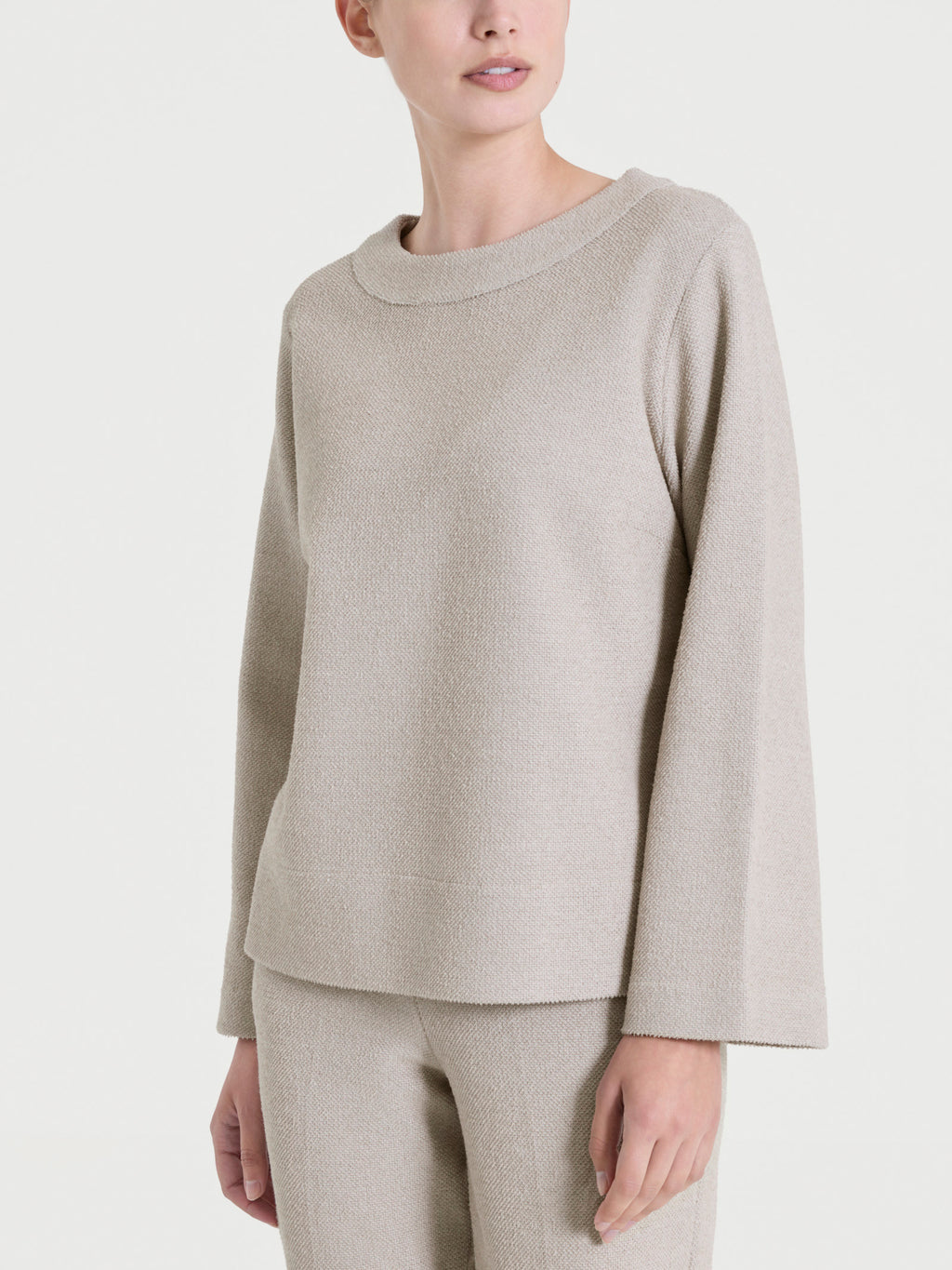 Dieses Kleidungsstück legt sich sanft um den Halsansatz und verleiht ihm ein elegantes Aussehen, während es gleichzeitig ein weiches und angenehmes Gefühl auf der Haut vermittelt. Die weiten Ärmel liegen leicht am Körper an, ohne einzuengen, und sind mit einem Saum abgeschlossen, der sich auch am unteren Saum des Kleidungsstücks wiederholt.