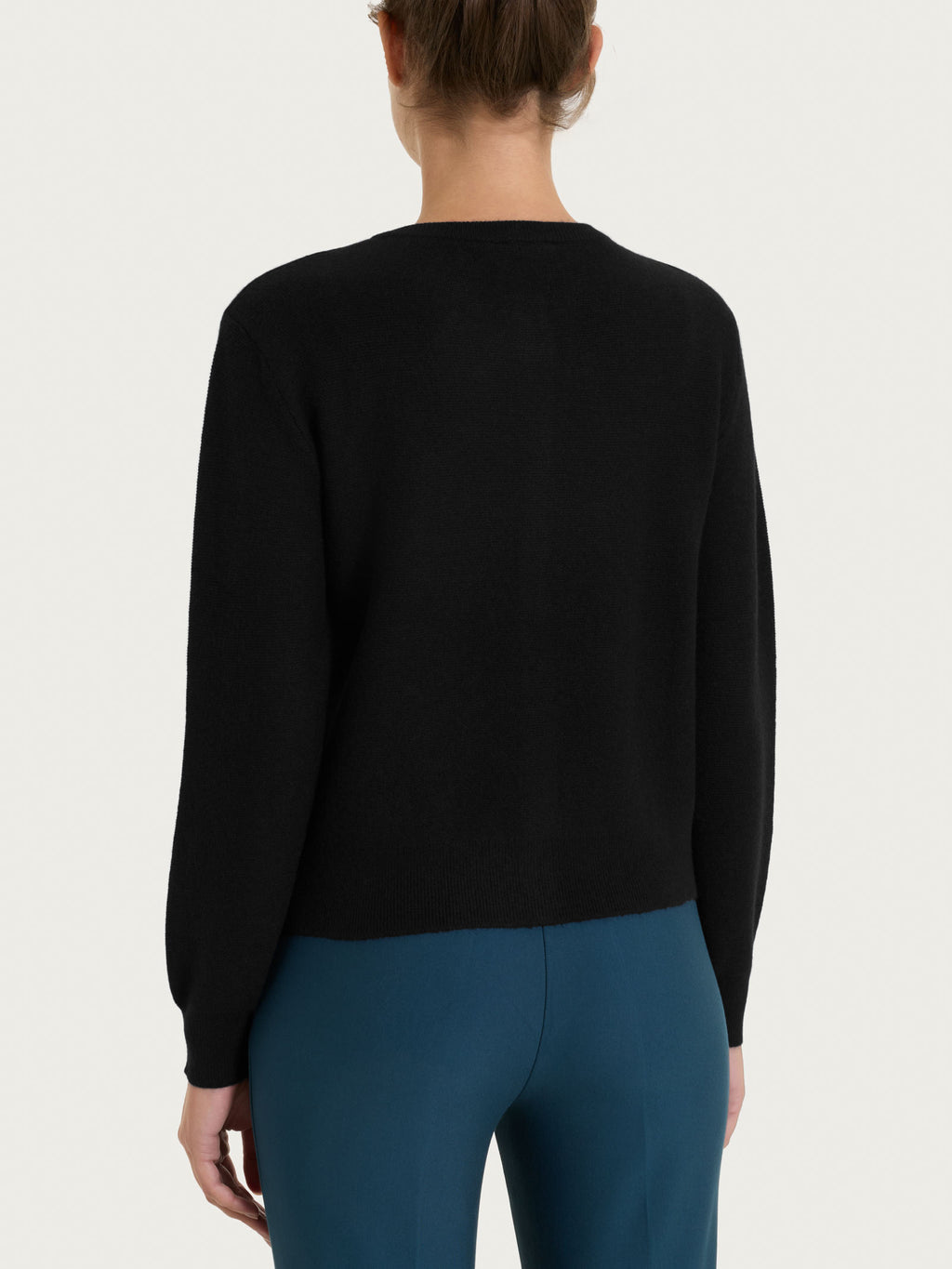 Kurze Damenstrickjacke mit Knopfverschluss, Rundhalsausschnitt und langen Ärmeln.