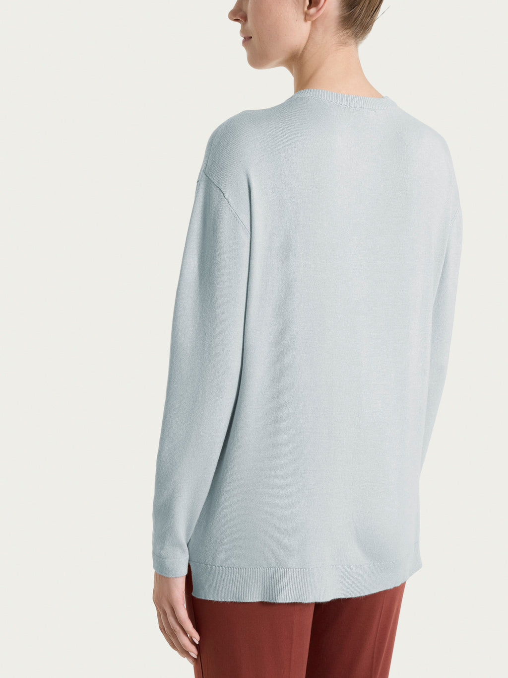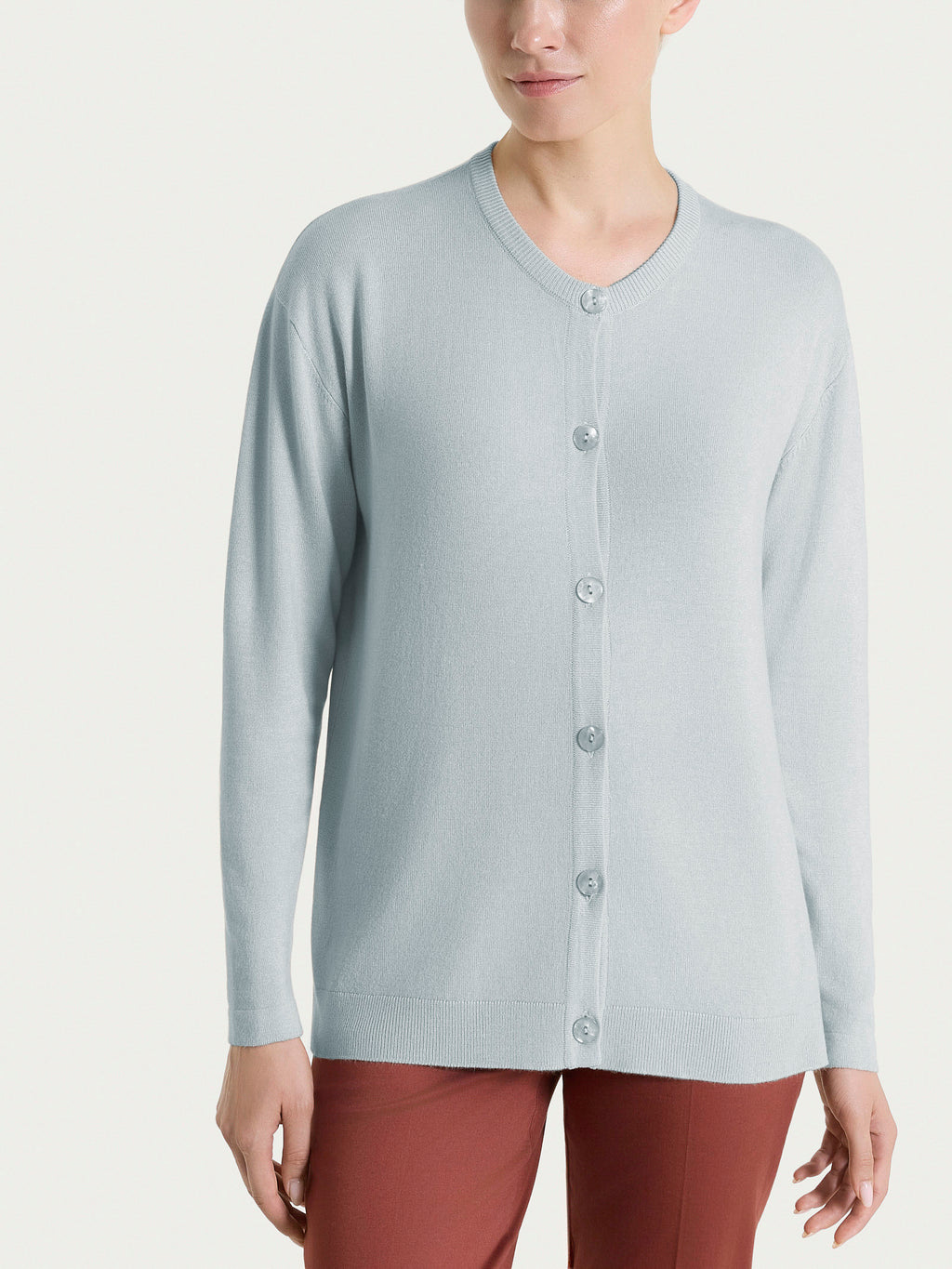 Damenstrickjacke in 12er Stärke mit langen Ärmeln, Rundhalsausschnitt und Knopfverschluss vorne.