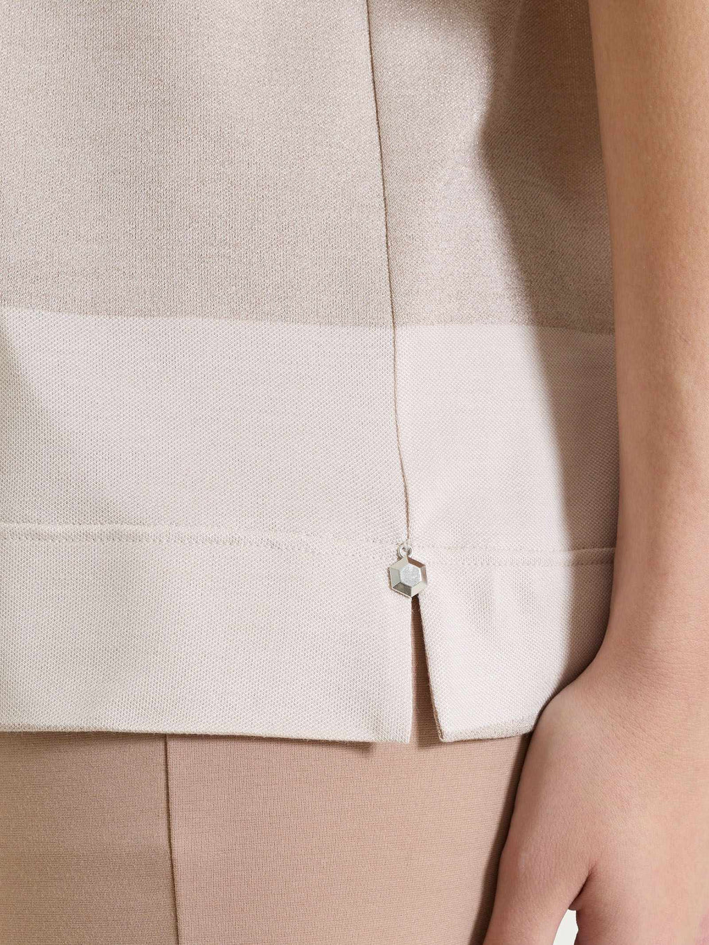 Der besondere Clou ist das Lurex-Makrostreifenmuster, ein leuchtendes und auffälliges Detail, das dem Design Eleganz verleiht und selbst den einfachsten Kombinationen Charakter verleiht.