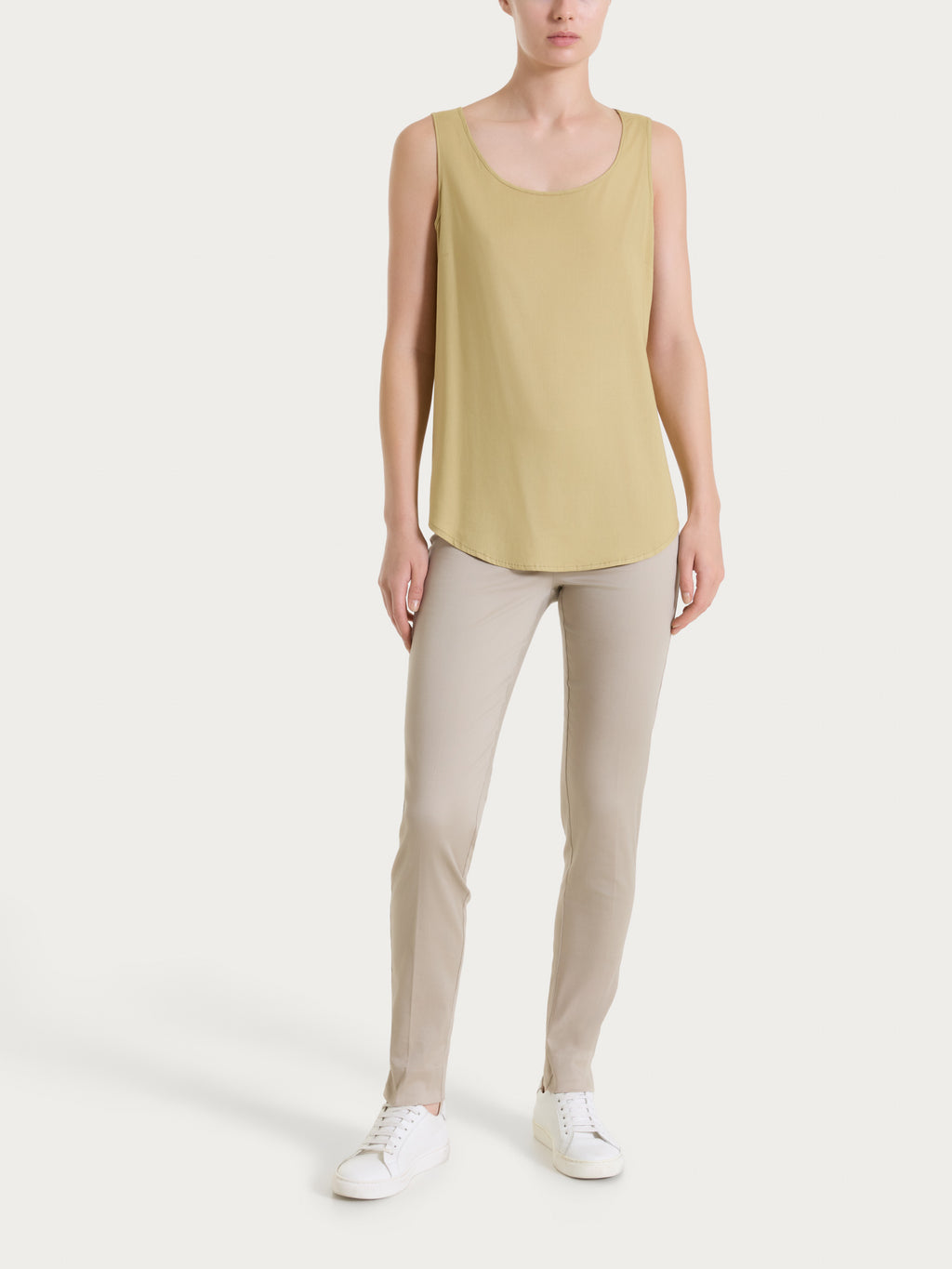 Dieses Modell ist mit einem Gummizug in der Taille, ohne Taschen und mit praktischen Seitenschlitzen am Knöchel ausgestattet, so bequem wie eine Leggings, ohne die Eleganz einer Hose zu verlieren.