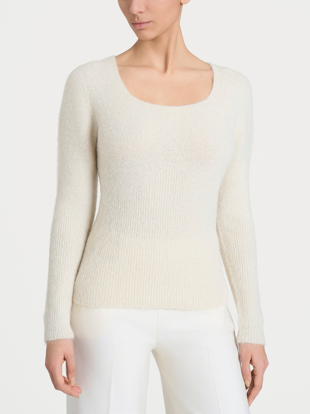Damenpullover mit Madonnenkragen aus einer Woll-Alpaka-Mischung, einem 7-Gauge-Gewebe, das warm, weich und voluminös ist.