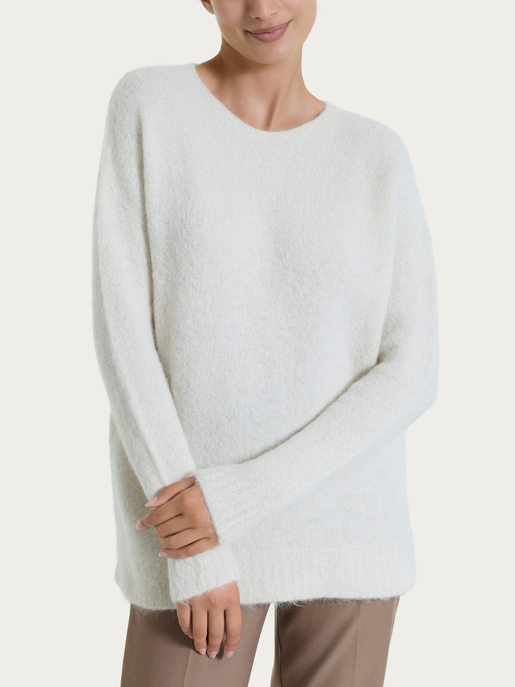 Damenpullover mit Rundhalsausschnitt aus einer Mischung aus Wolle und Alpaka, gewebt aus einem warmen, weichen und voluminösen 7-Gauge-Gewebe.
