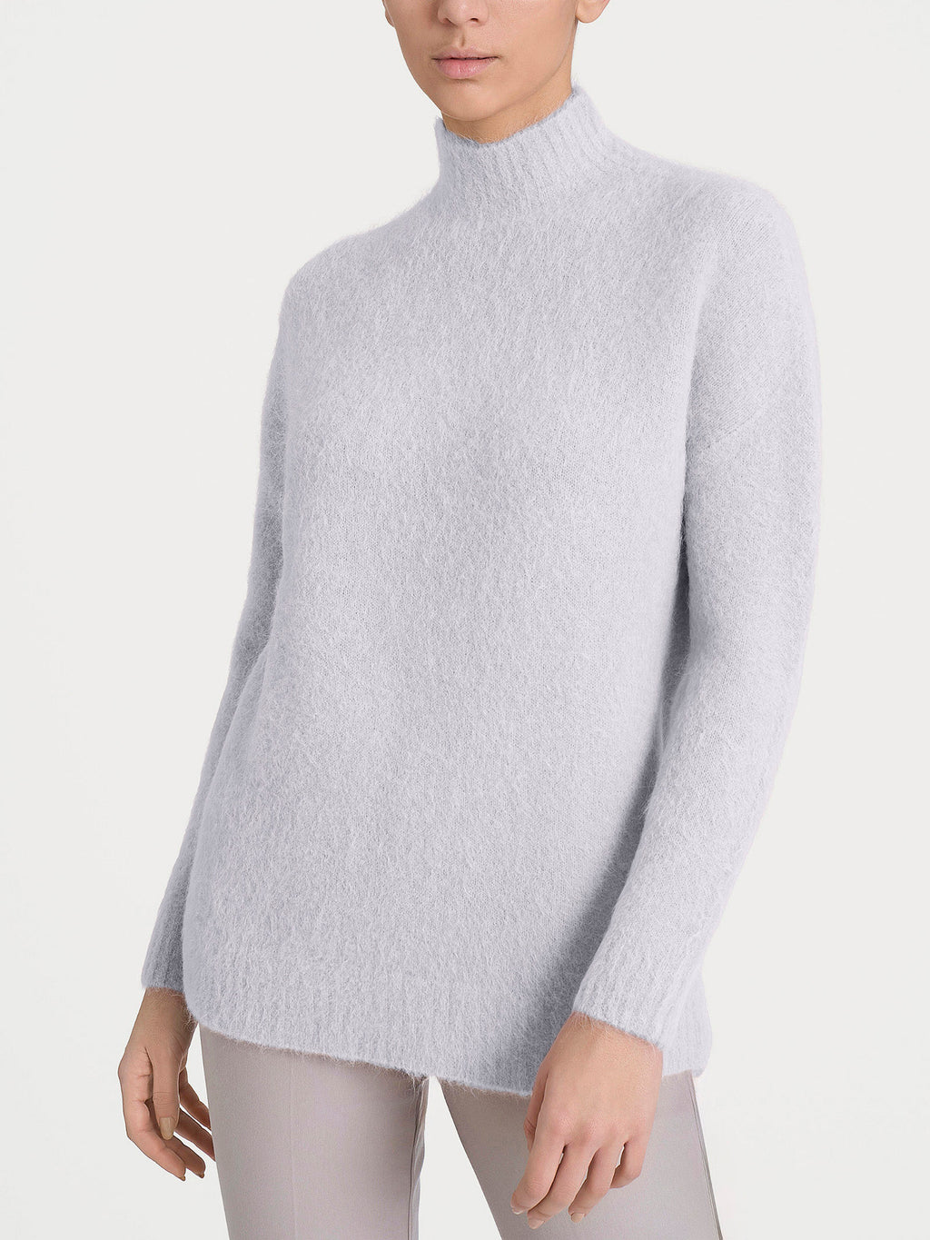 Der Pullover aus Alpakamischung zeichnet sich durch seine warme, weiche und natürlich umhüllende Textur aus. Der hohe Alpaka-Anteil verleiht ihm einen weichen und samtigen Griff mit einem leicht haarigen und unregelmäßigen Erscheinungsbild, während die Wolle seine Wärme verstärkt und ihn ideal für die kälteren Monate macht.