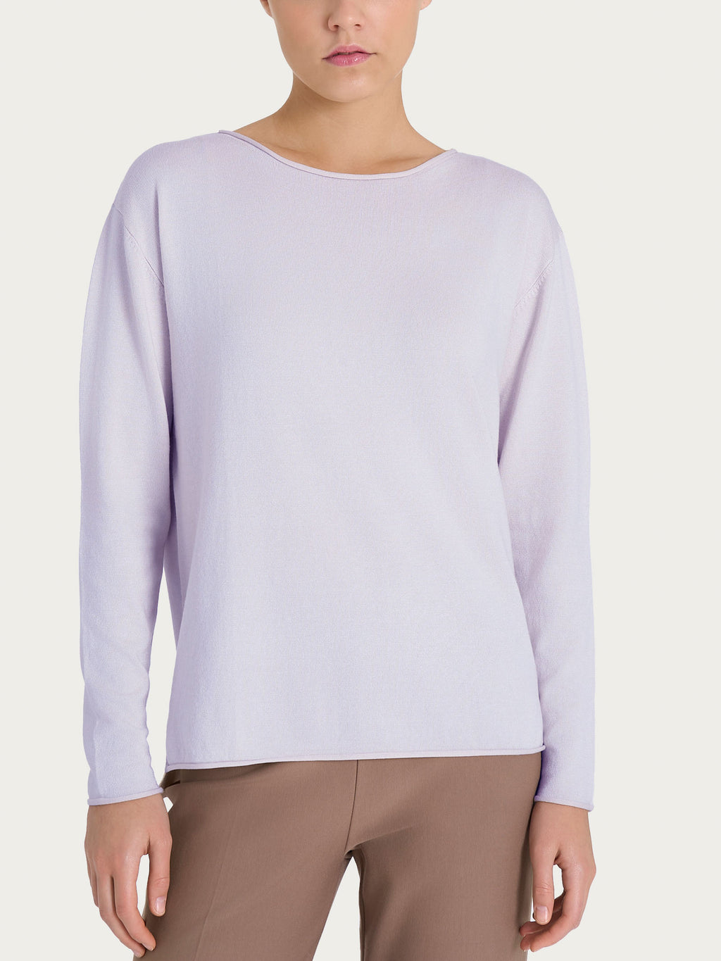 Die weiche Passform umhüllt die Figur sanft, ohne einzuengen, und betont die Form auf natürliche Weise. Der Bootsausschnitt verleiht eine schlichte und raffinierte Note, perfekt um einen essentiellen, aber raffinierten Look zu vervollständigen.