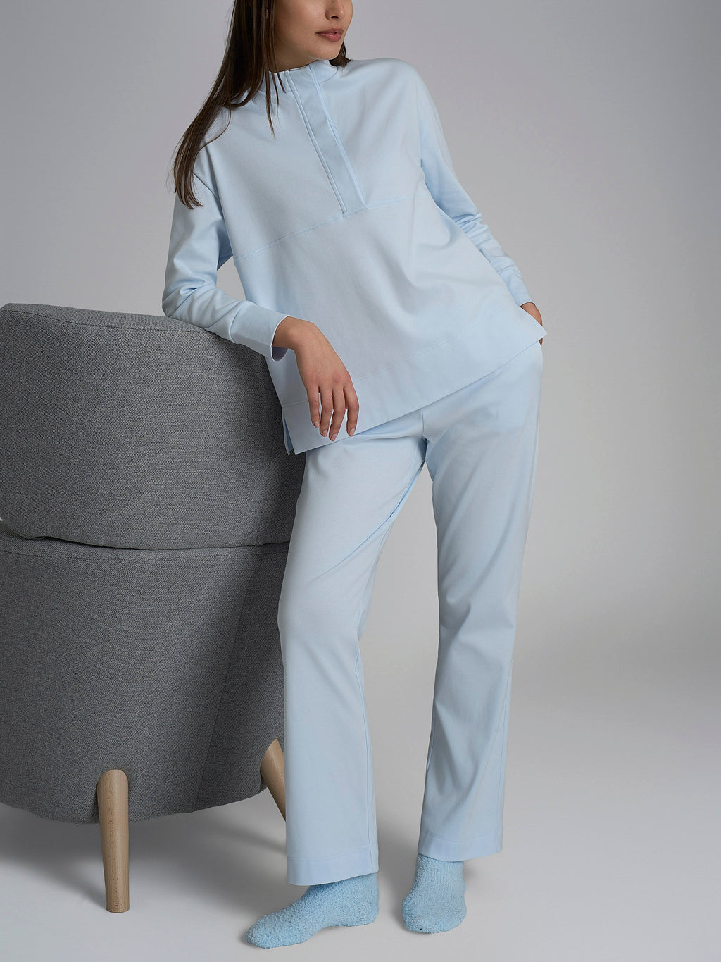 Erhältlich in einer Auswahl weicher und beruhigender Pastelltöne, ist dieser Pyjama ideal für alle, die Komfort und einen unverzichtbaren Stil mit einem Hauch von dezenter Eleganz suchen.