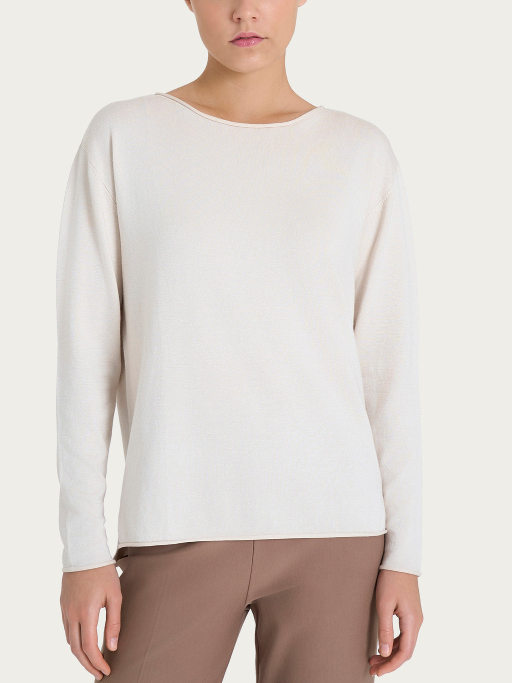 Die weiche Passform umhüllt die Figur sanft, ohne einzuengen, und betont die Form auf natürliche Weise. Der Bootsausschnitt verleiht eine schlichte und raffinierte Note, perfekt um einen essentiellen, aber raffinierten Look zu vervollständigen.