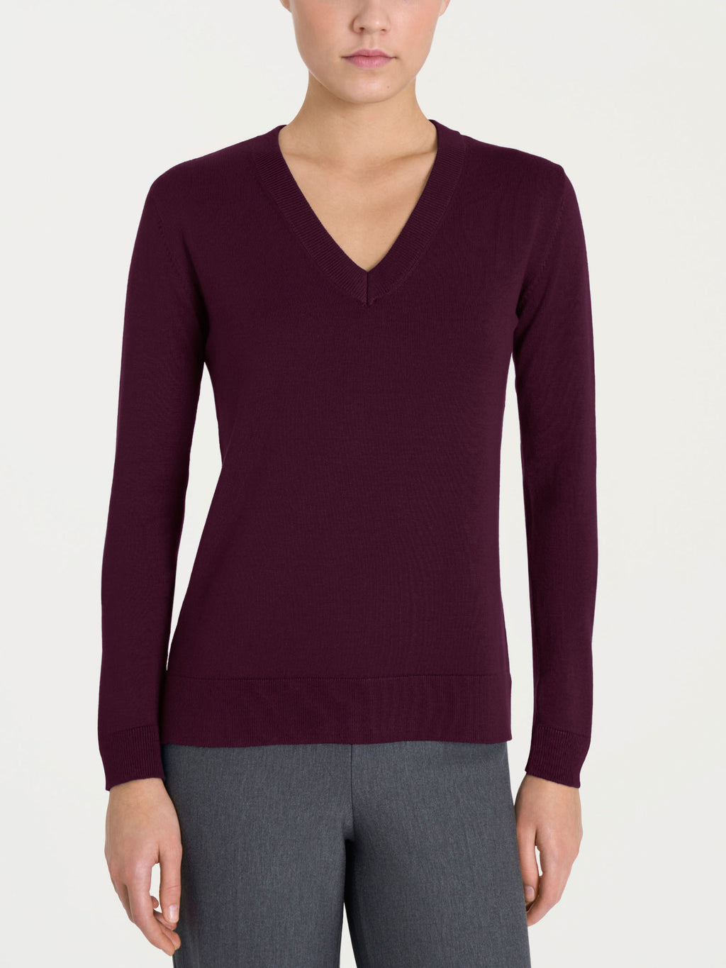 Langärmeliger Damenpullover mit V-Ausschnitt aus einer 12-Gauge-Viskosemischung, atmungsaktiv, thermoregulierend und bequem.