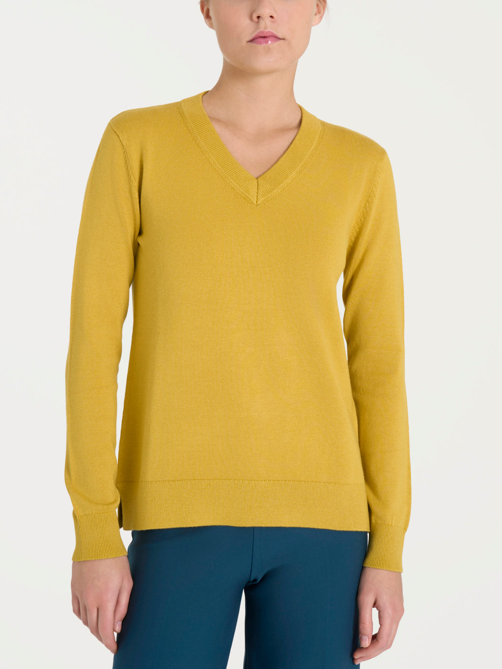 Langärmeliger Damenpullover mit V-Ausschnitt aus einer 12-Gauge-Viskosemischung, atmungsaktiv, thermoregulierend und bequem.