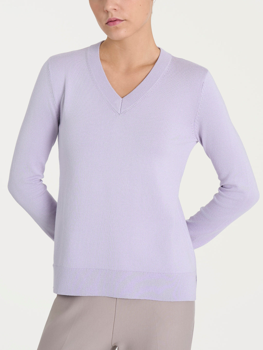 Langärmeliger Damenpullover mit V-Ausschnitt aus einer 12-Gauge-Viskosemischung, atmungsaktiv, thermoregulierend und bequem.
