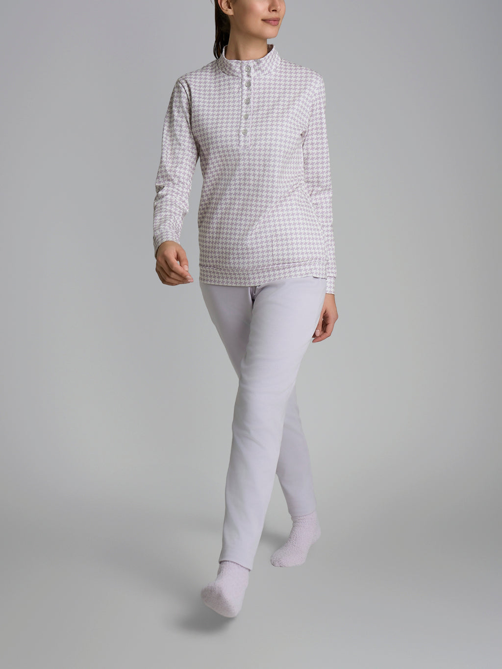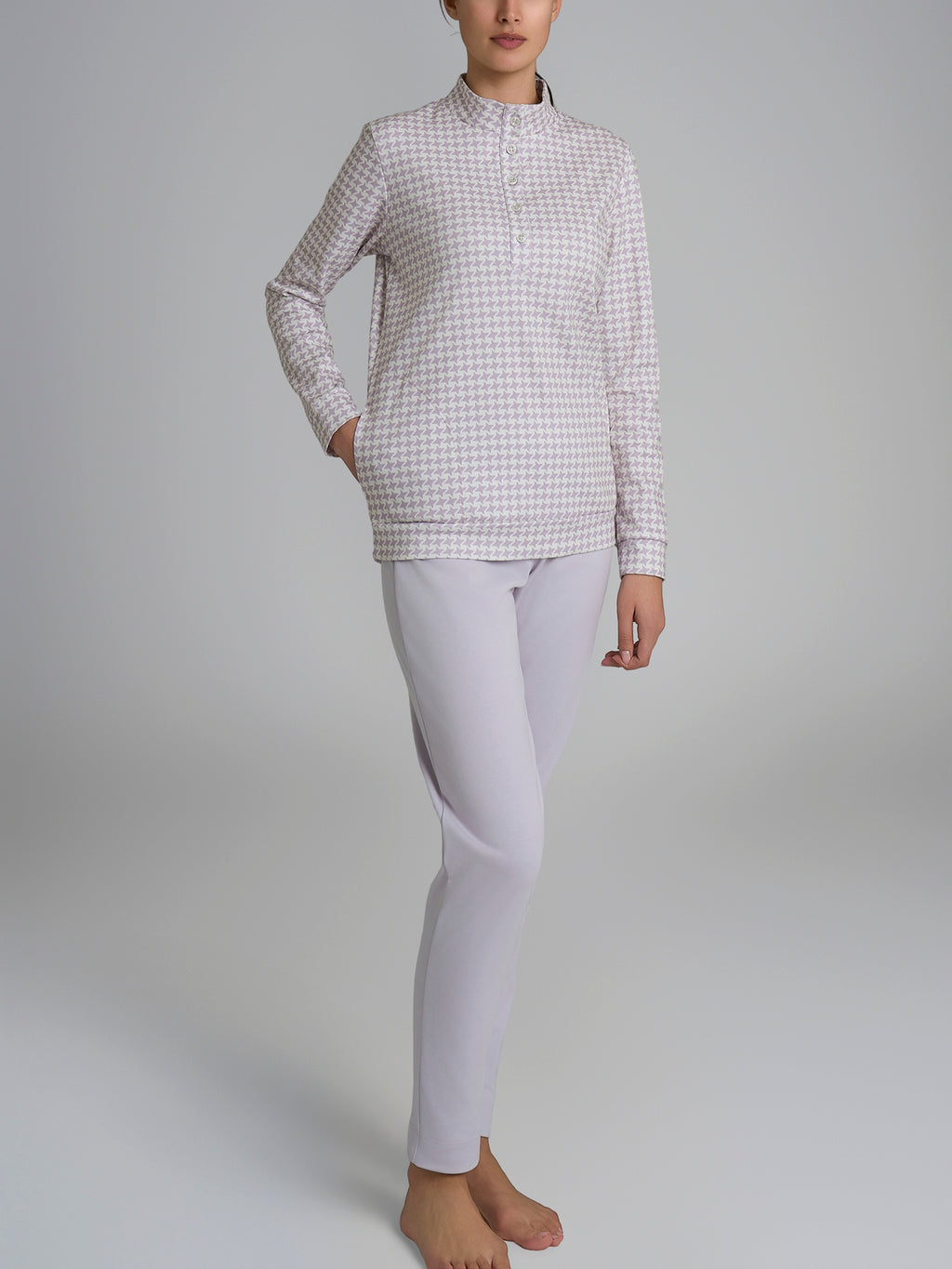 Bestehend aus einer langärmeligen Tunika mit Fünf-Knopf-Serafino-Ausschnitt und Stehkragen, mit einem ganzflächigen Hahnentrittmuster, das einen eleganten Kontrast und ein unverwechselbares Element bildet. An der Seite befinden sich praktische Paspeltaschen, in denen Gegenstände verstaut werden können.
