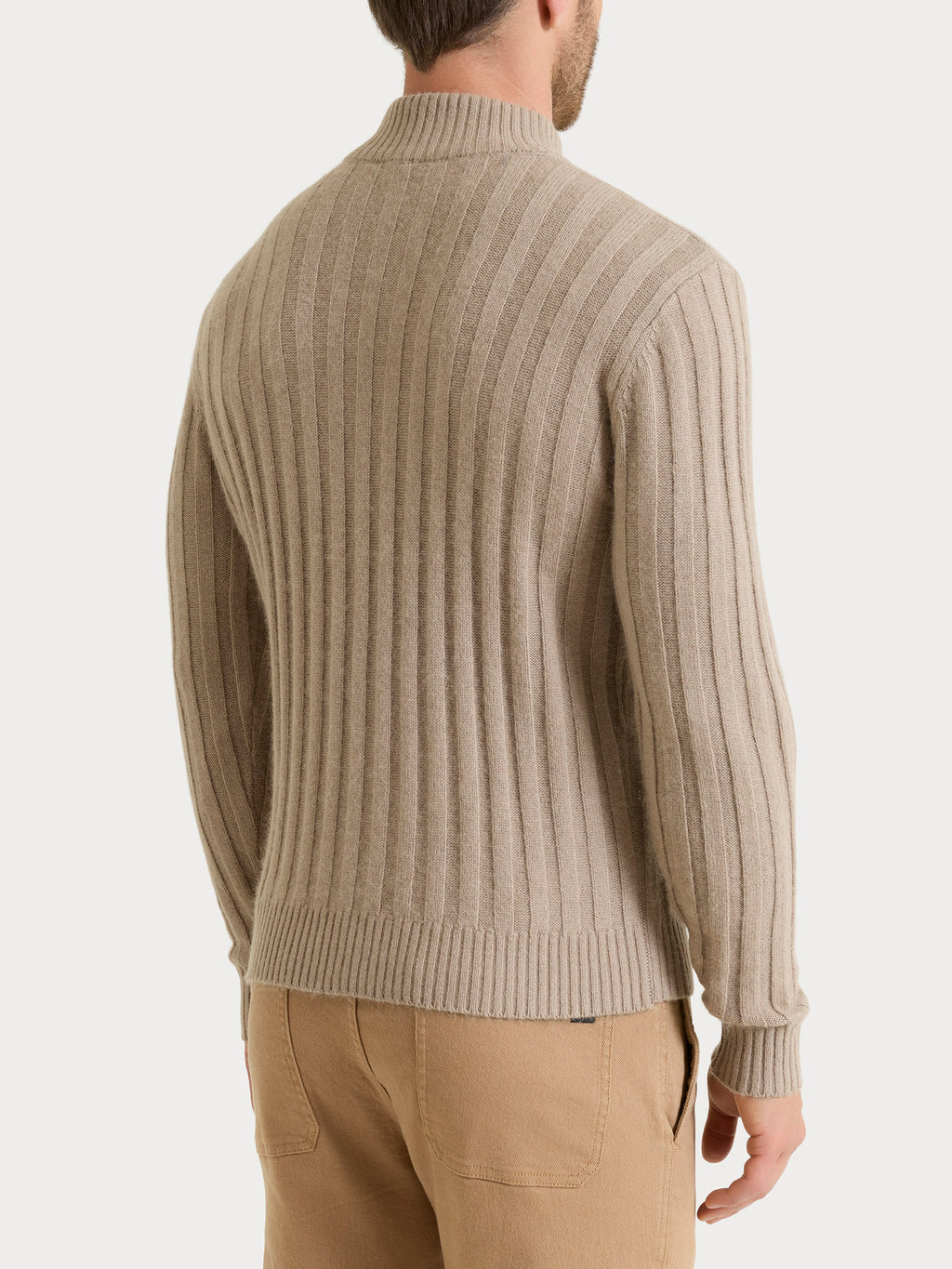 Er zeichnet sich durch einen 5x5 Flachrippstrick aus, der sich über die gesamte Oberfläche des Kleidungsstücks erstreckt und eine entscheidende und moderne Textur verleiht.