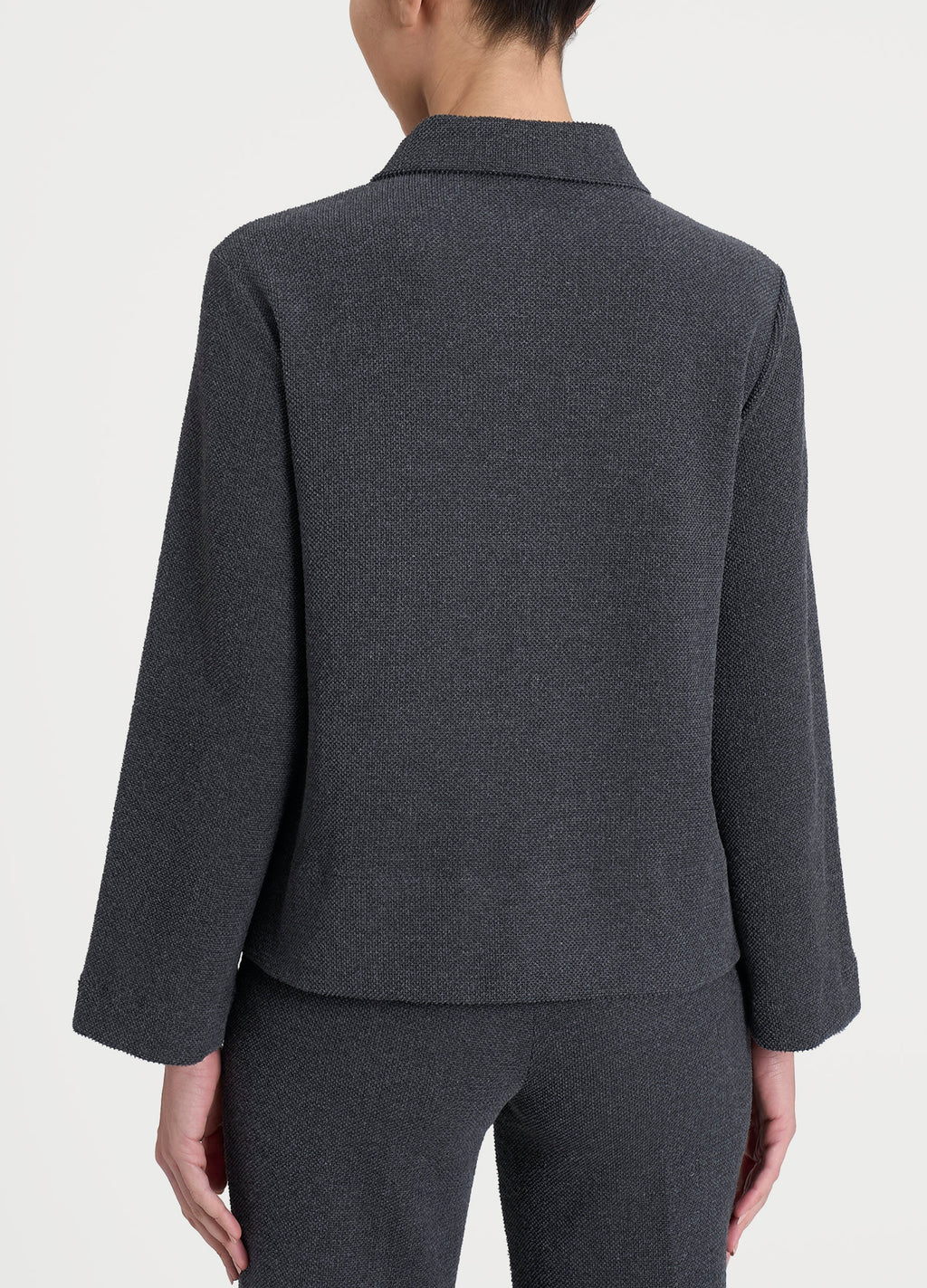 Die weiten Ärmel liegen leicht am Körper an, ohne einzuengen, und sind mit einem Saum abgeschlossen, der sich auch am unteren Saum des Kleidungsstücks wiederholt.