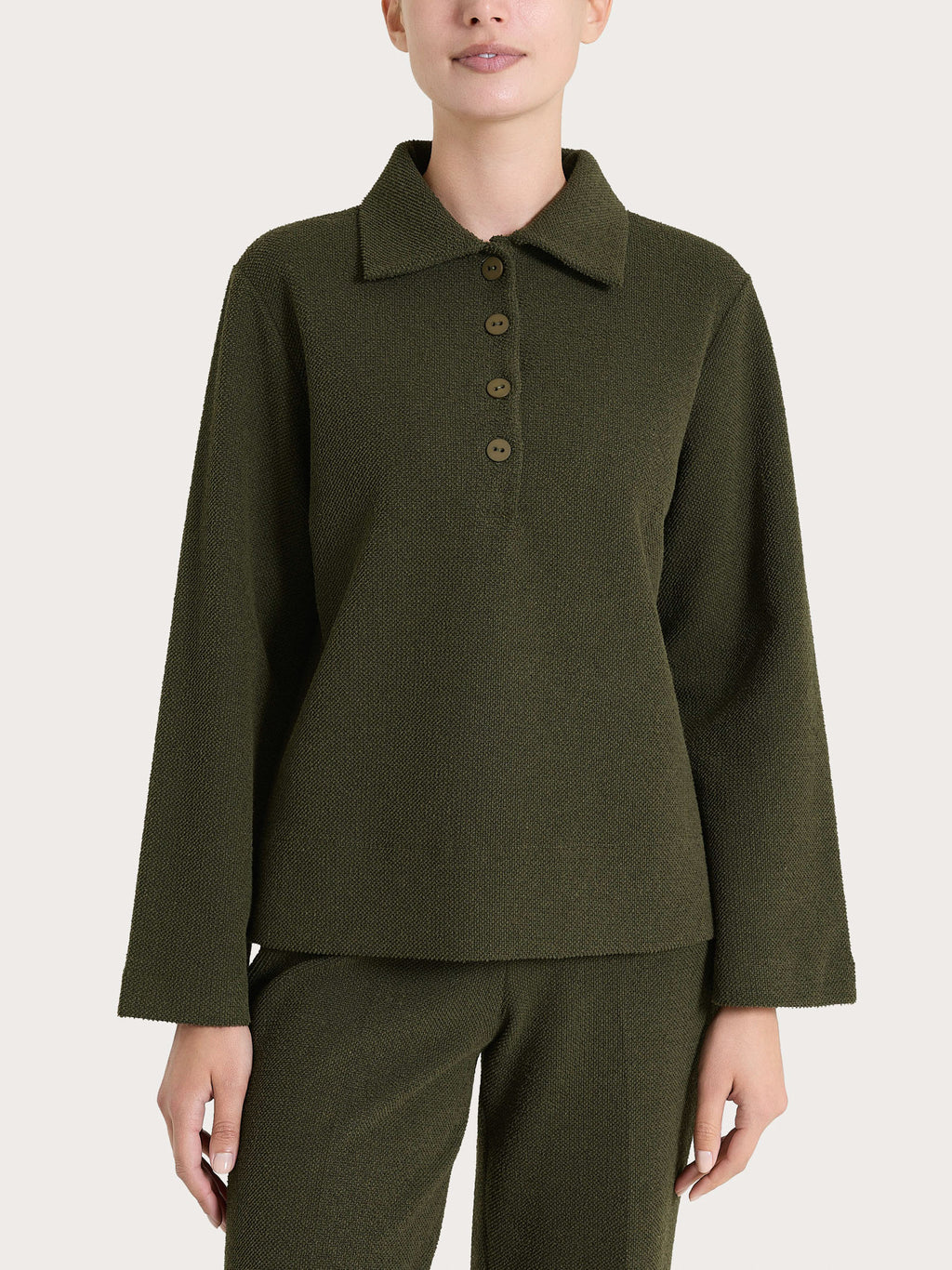 Dieses Kleidungsstück zeichnet sich durch einen Kragen mit vier praktischen Knöpfen aus, die das Tragen erleichtern und gleichzeitig ein wichtiges Stildetail darstellen.