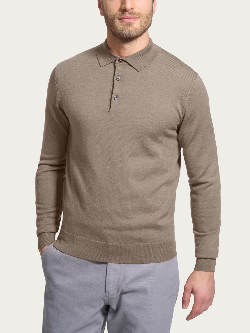 Langärmeliges Herren-Poloshirt aus reiner Merinowolle, gewebt in 12-Gauge, extrem weich und warm.