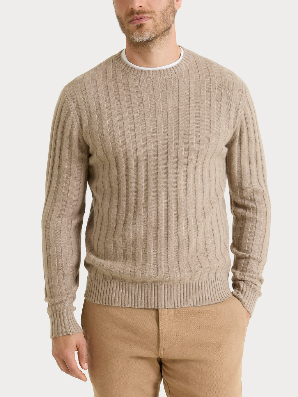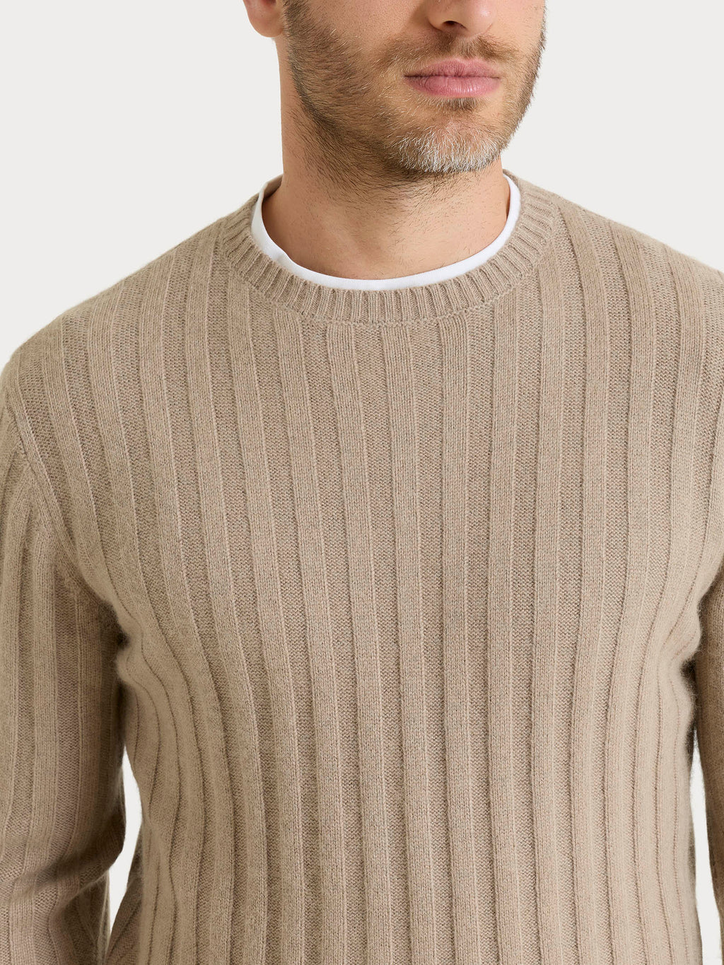 Der 5x5 Flachrippenstrick, der sich über die gesamte Oberfläche des Kleidungsstücks erstreckt, verleiht ihm eine entschiedene und moderne Textur.