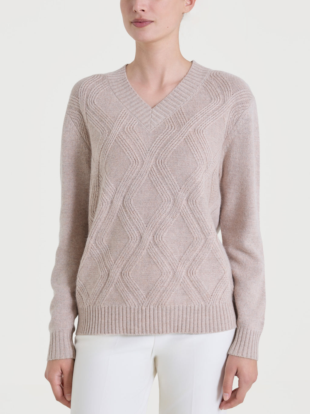 Er zeichnet sich durch einen geprägten Zopfstrick aus, der sich elegant über die Vorderseite des Kleidungsstücks zieht und ihm Tiefe verleiht, während er gleichzeitig einen schlichten und raffinierten Stil beibehält.