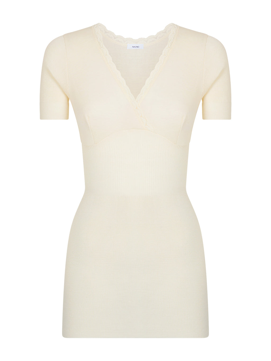 Bequemes Kurzarm-T-Shirt aus glattem Strick mit geripptem Übergang aus reiner, extrafeiner Merinowolle von mittlerem Gewicht, verziert mit einer Spitzenbordüre am Halsausschnitt