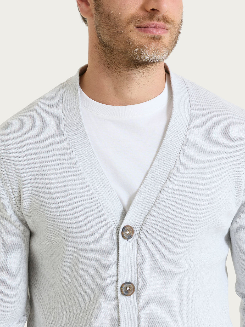 Herren-Strickjacke mit V-Ausschnitt aus rasierter reiner Baumwolle, gewebt in der Feinheit 5, leicht und bequem, ohne dabei auf unverwechselbare Wärme zu verzichten.