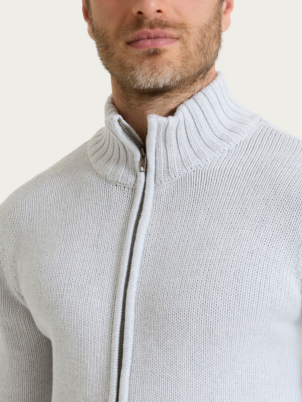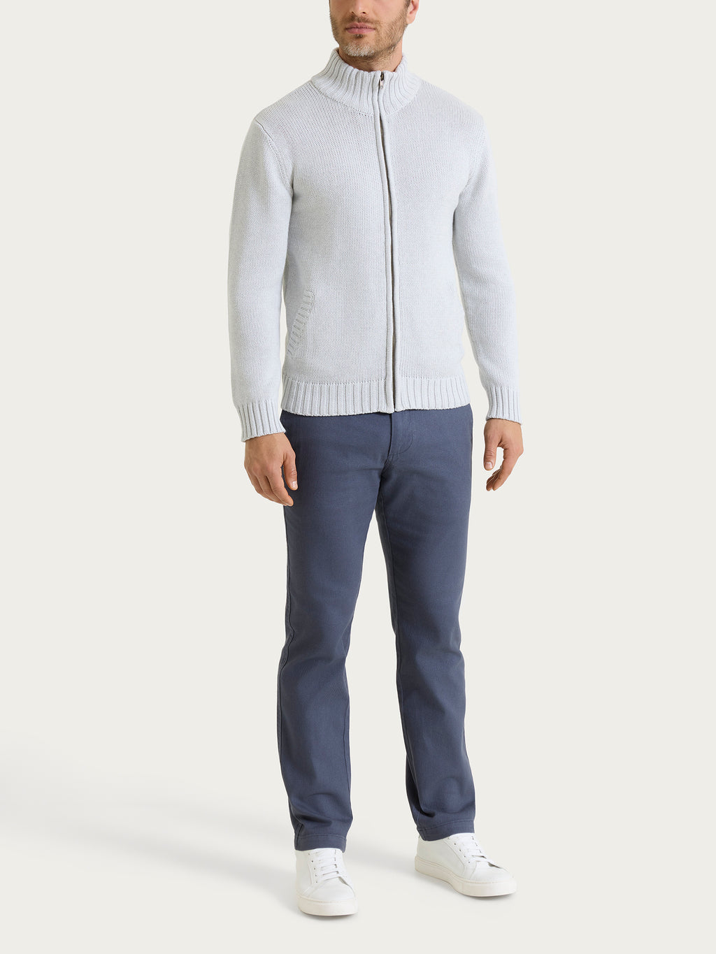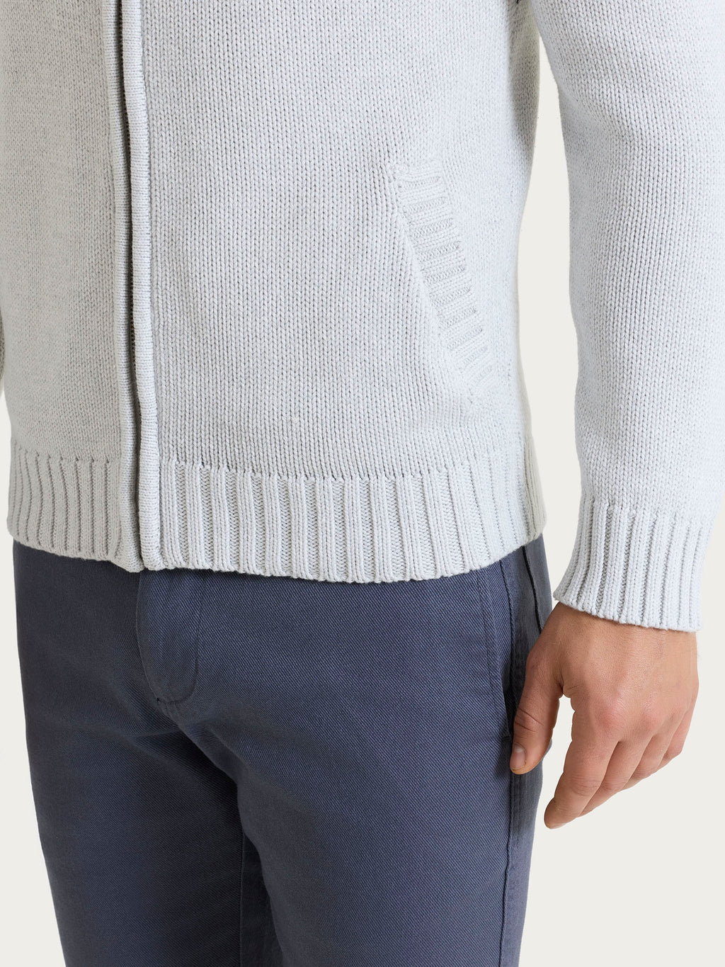 Offene Herren-Strickjacke aus reiner Baumwolle, gewebt in Feinheit 3, mit einer leichten Textur, die Wärme und Komfort garantiert, ohne zu beschweren.