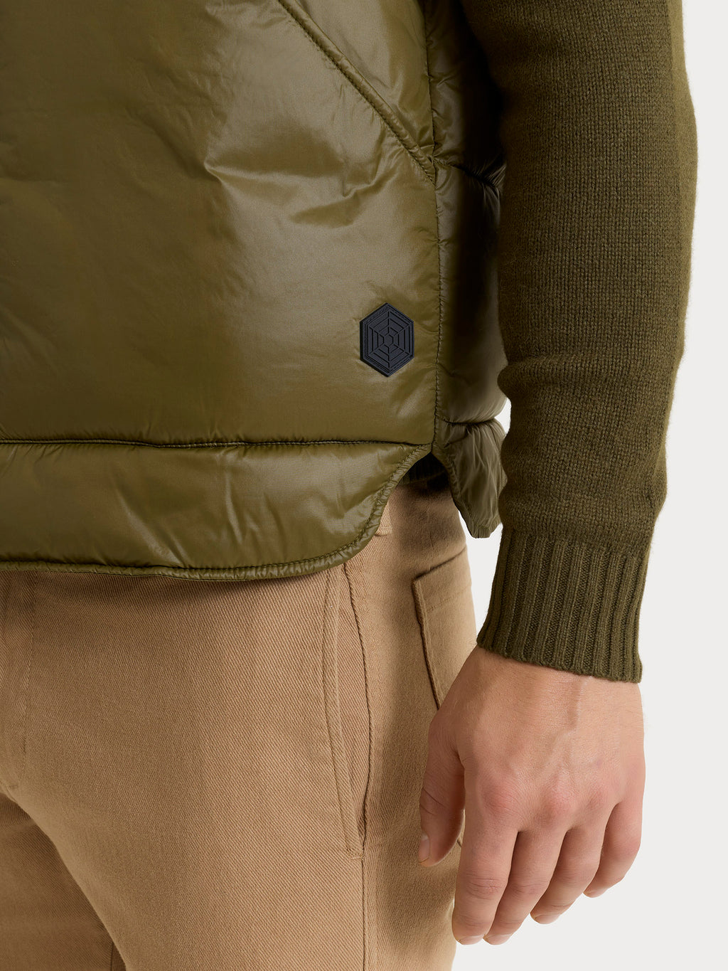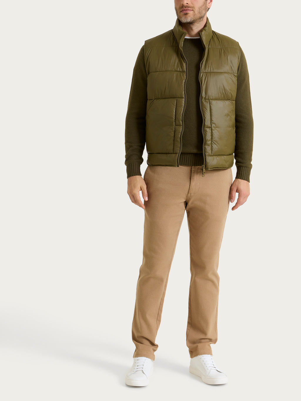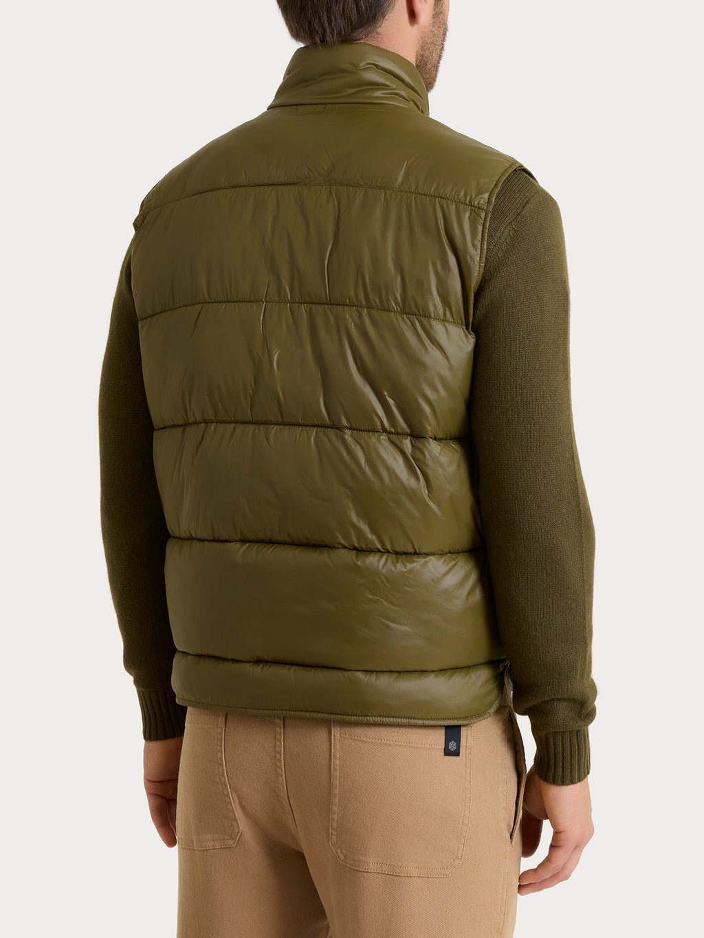 Ein ärmelloses Modell mit essentiellem und zeitgemäßem Design, das mit einem praktischen Doppelschieber-Reißverschluss ausgestattet ist, der Vielseitigkeit und Bewegungsfreiheit garantiert, ergänzt durch praktische Seitentaschen, die sich ideal für die diskrete und funktionelle Aufbewahrung von wichtigen Gegenständen eignen, und einen sanft umgeschlagenen Mandarinkragen.