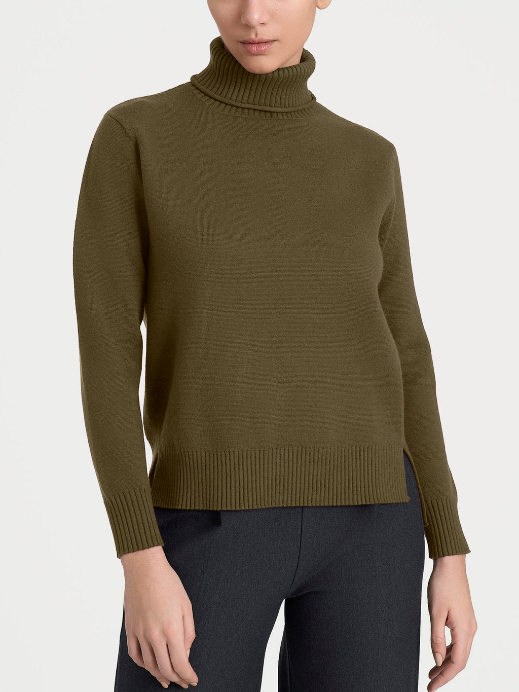 Women's roulè neck sweater made of viscose, 12-gauge fabric that is warm, soft and practical.This turtleneck model features practical side openings and practical cuffs that echo the 3x3 rib trim el...