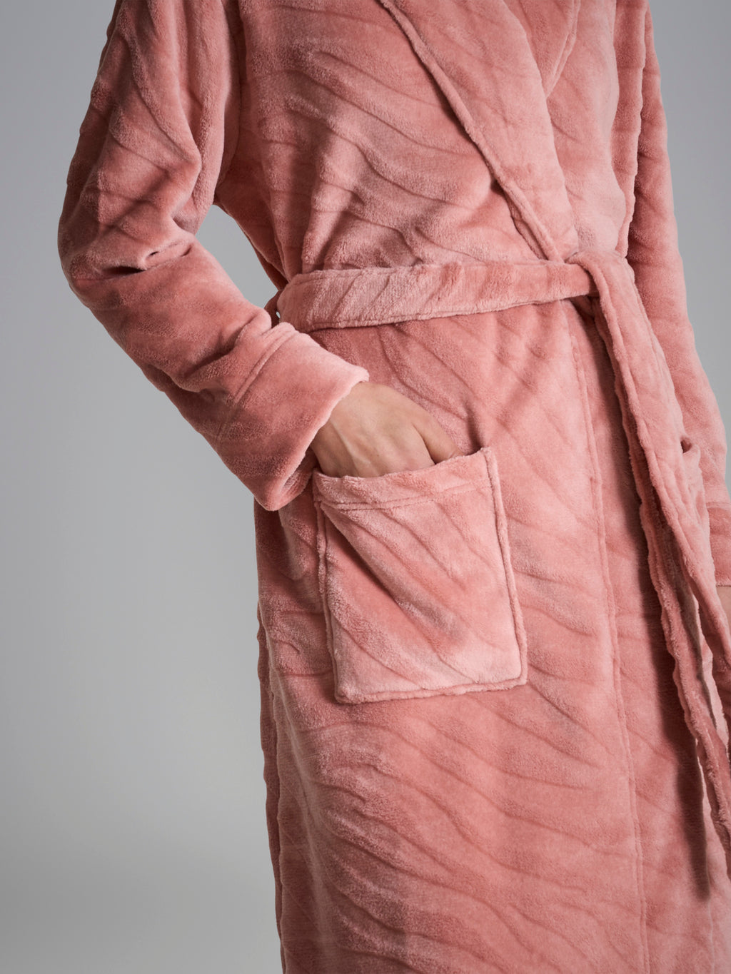 Made of Coral Fleece, a microfiber fabric known for its extraordinary softness and velvety feel. It is softer and denser than traditional fleece and is distinguished by its compact and warm texture, which effectively retains body heat while offering a snug and comfortable feel against the skin.