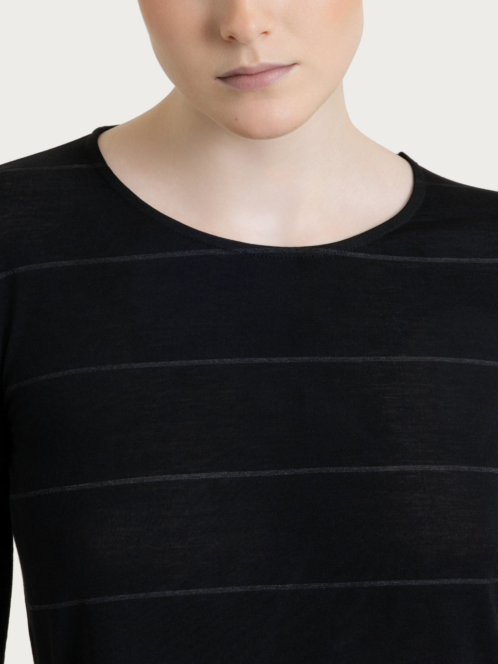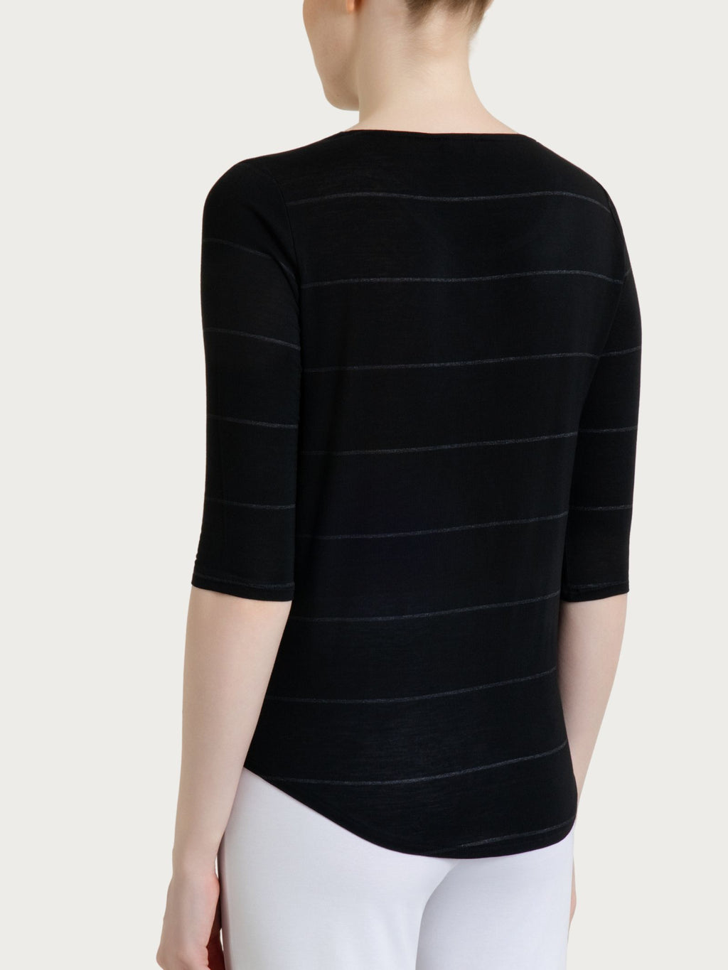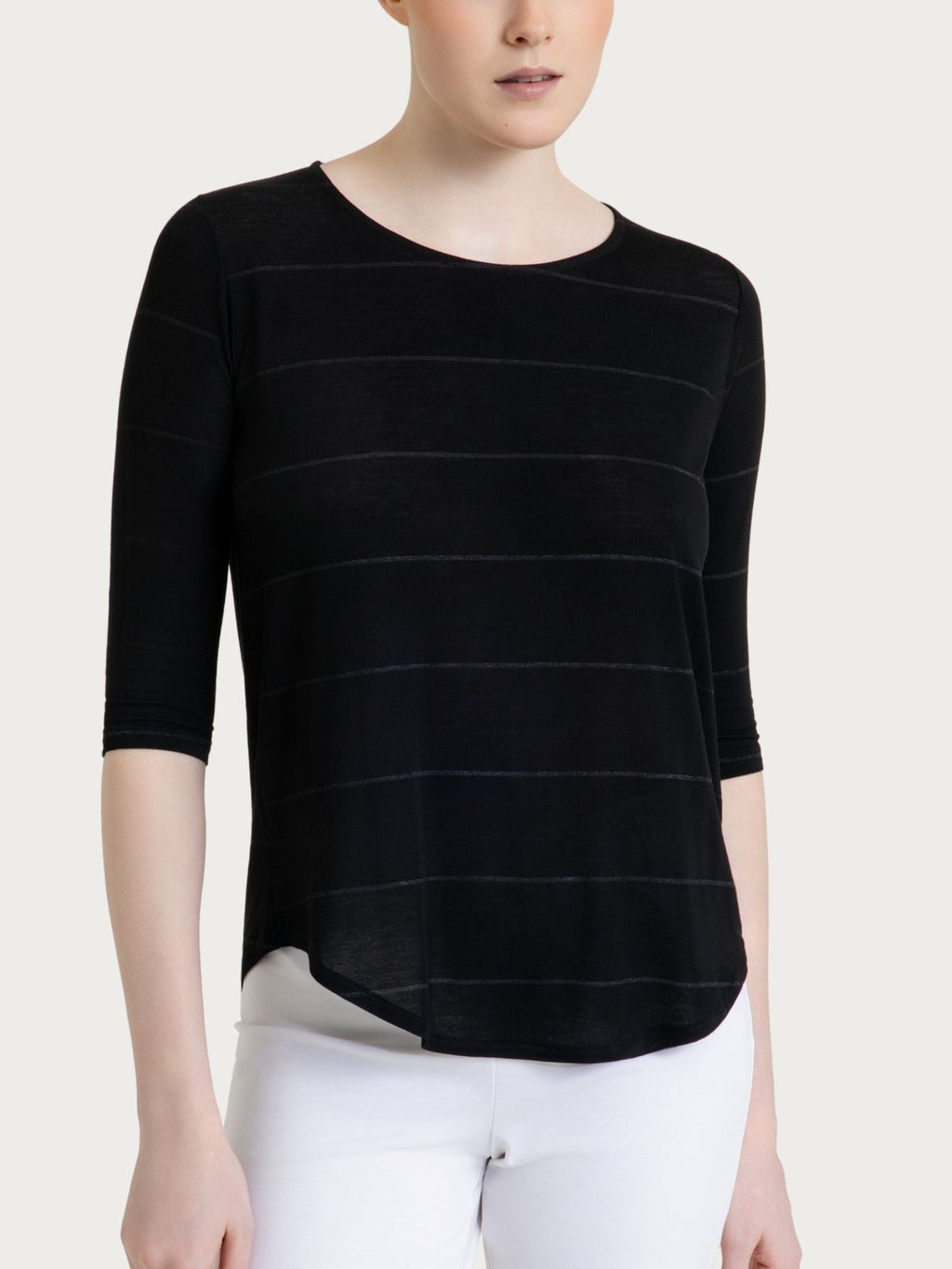 Women's crew-neck, 3/4-sleeve t-shirt with a light and bright look.The garment features a micro-striped lurex pattern, a refined detail that discreetly ...