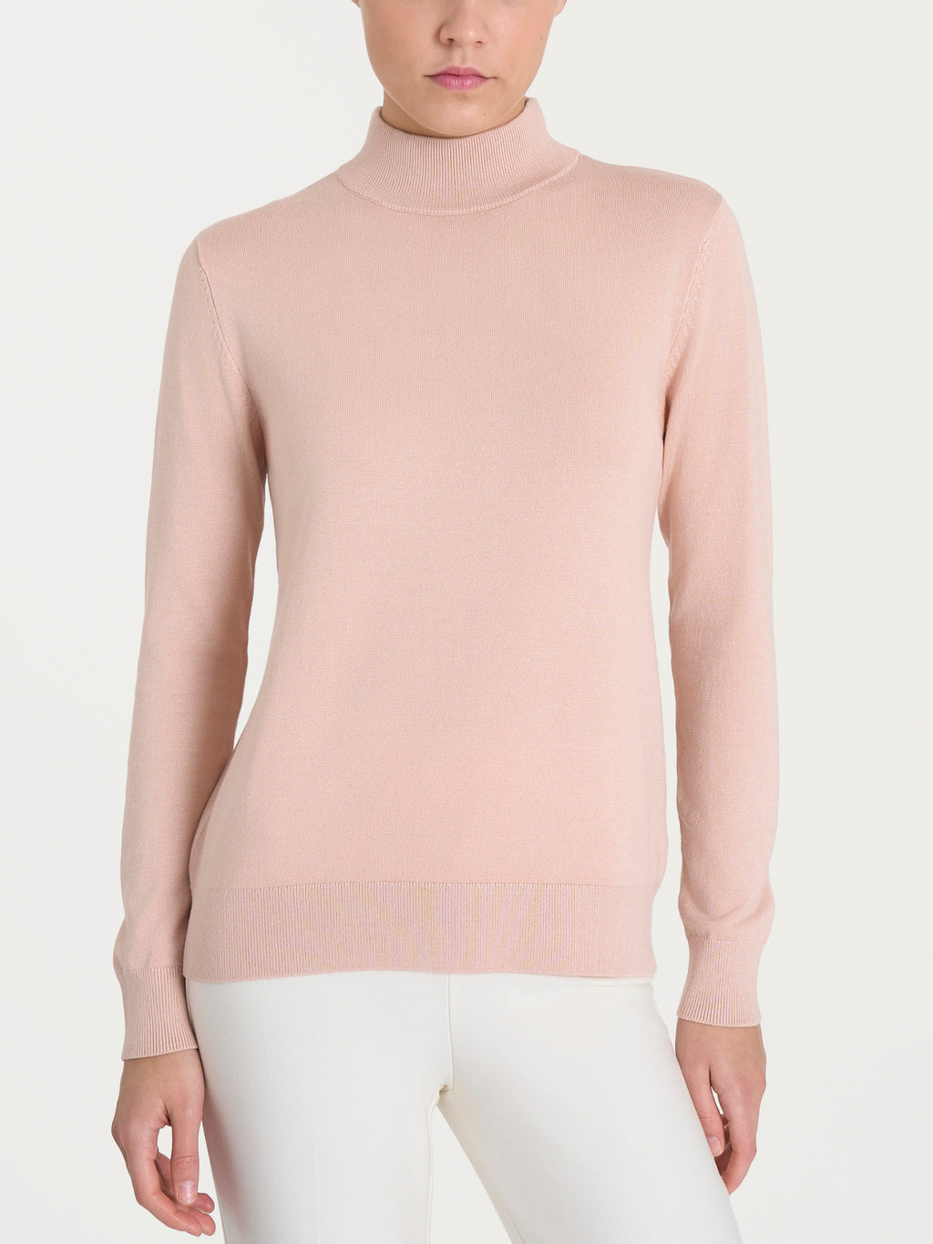 The mock neck adds a touch of elegance and comfort, making the sweater easy to match with various wardrobe pieces. Ideal for creating fashionable looks, it pairs perfectly with Ragno's pants. The sweater gently hugs the body without tightening, enhancing the feminine silhouette gracefully.