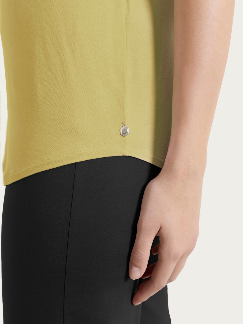 V-neck t-shirt with delicate slits to further define the opening.It has practical 3/4 sleeves for extra cov...