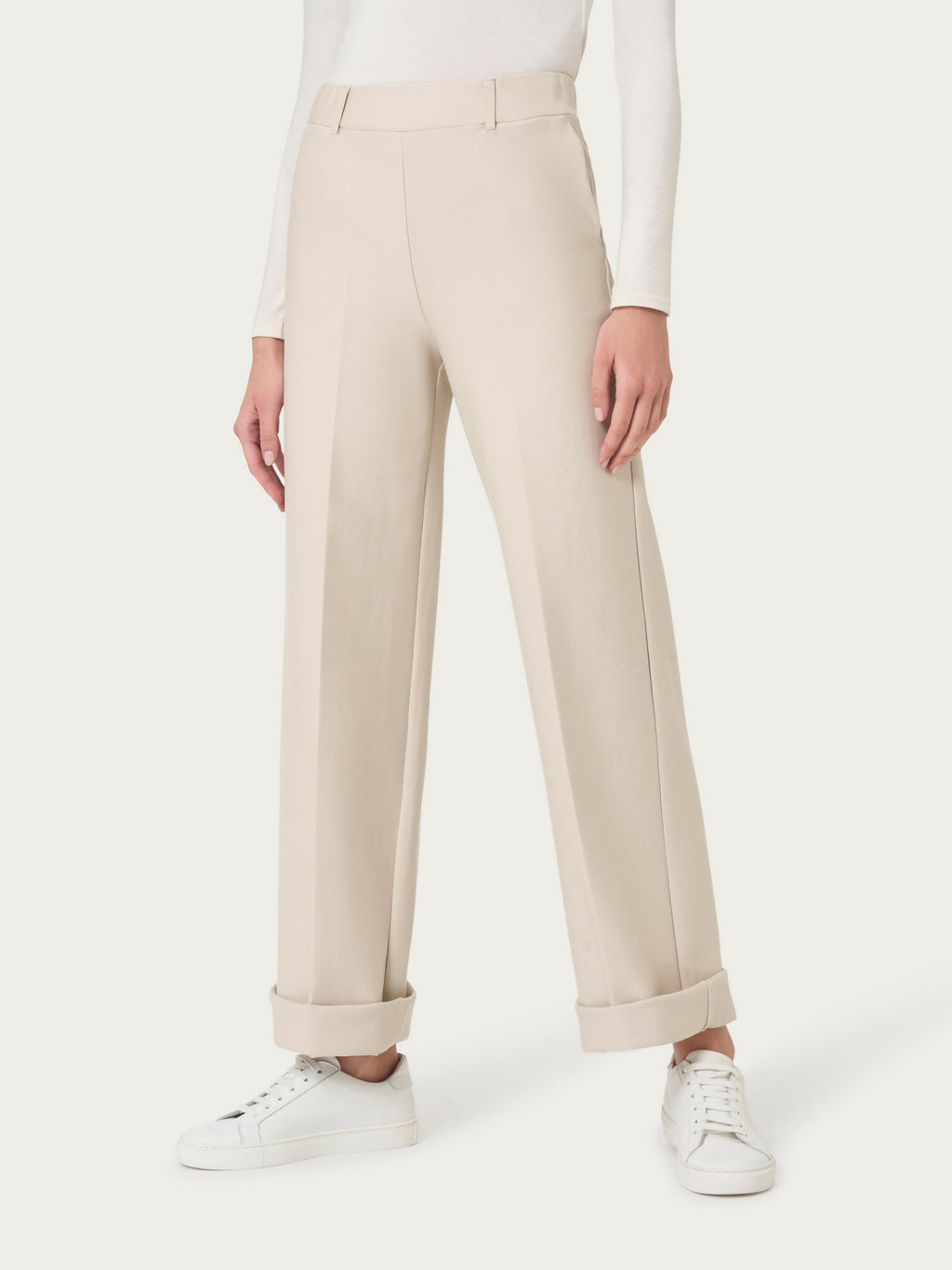 Women's pants with wide-leg pockets and ankle length with turn-ups.