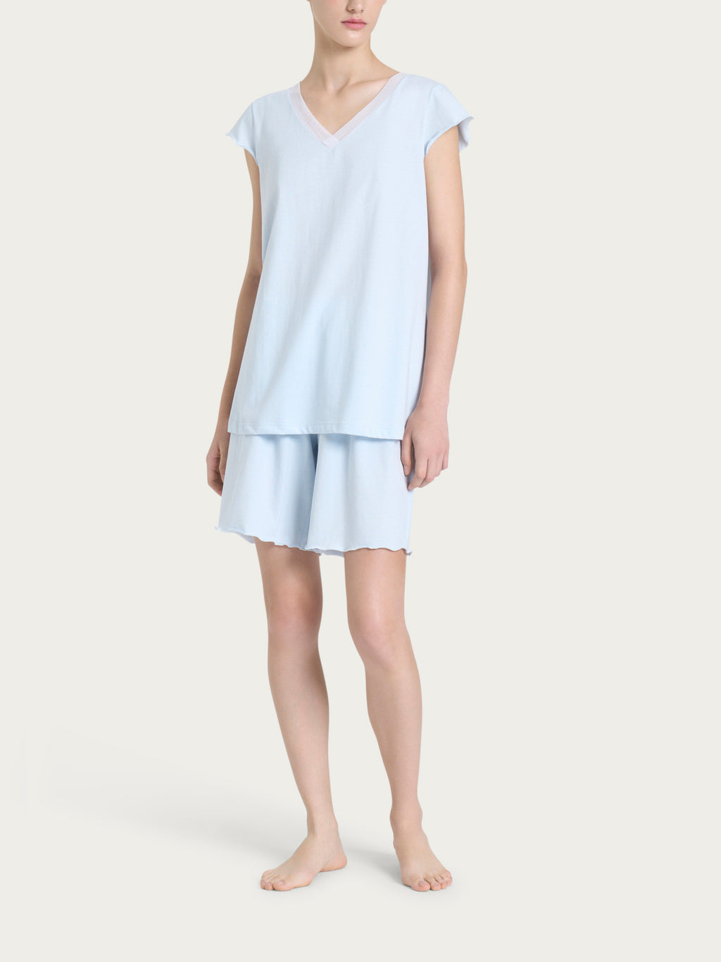 Available in a selection of delicate pastel shades, it satisfies every style preference, even during nighttime hours. Perfect for warm summer evenings, it combines elegance and simplicity, enveloping you in a pleasant feeling of coolness and well-being. Ideal to match with the coordinating robe.