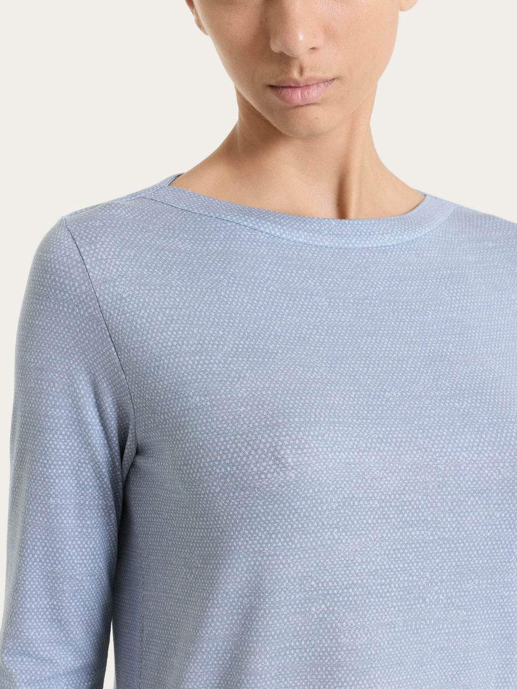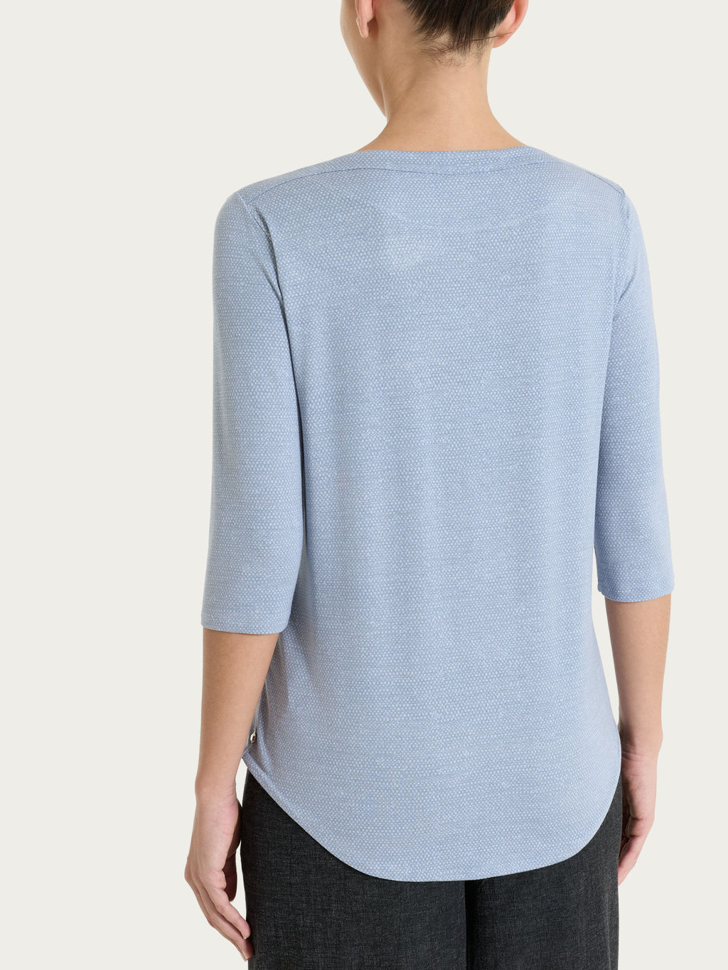 The model features a boat neckline that enhances the shoulders and gives a feminine and refined line, while the 3/4 sleeves gently accompany the arm making the garment ideal for mid-season and milder days.