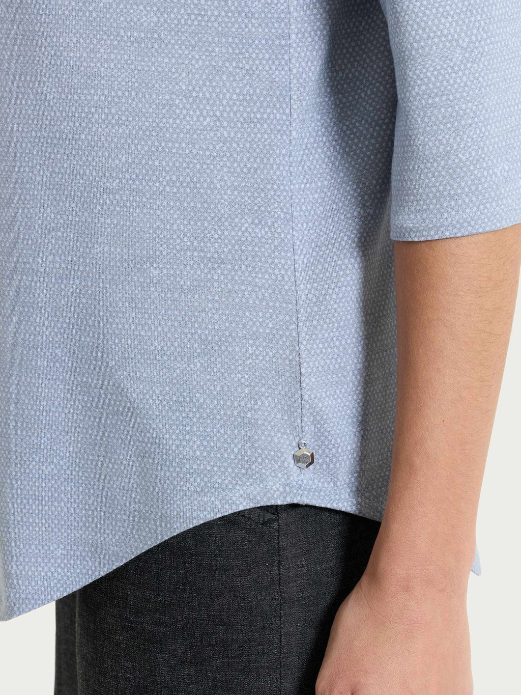 This garment is distinguished by the sweater-effect print design, an original and refined detail that adds depth to the look and recalls the look of knitwear with the practicality of a T-shirt.