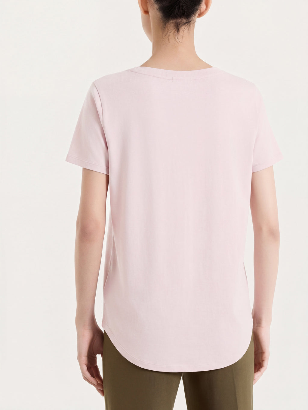 The V-neckline defines the neckline with a clean, sleek silhouette, while the short sleeve makes it ideal for warm weather and practical everyday outfits.