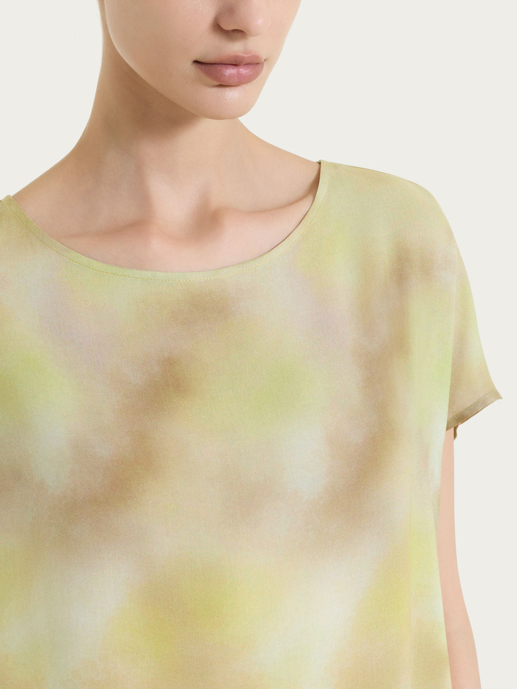 The garment stands out for its all over pattern with watercolor-effect degradé shades, soft and harmonious: a play of light colors and delicate transitions that gives the look a modern elegance, without being excessive.