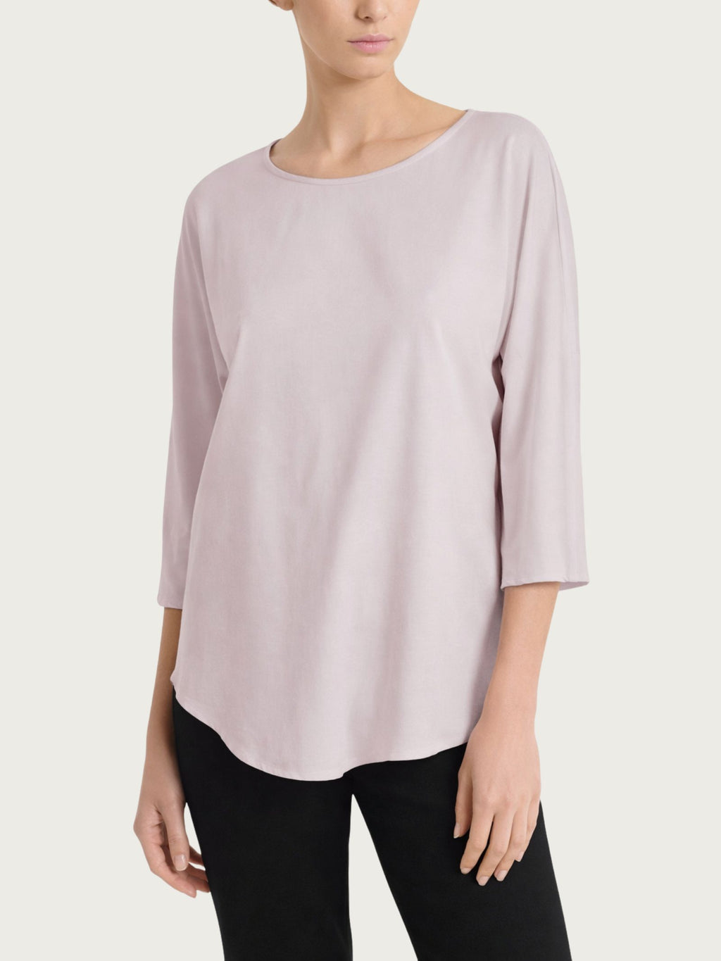 Women's blouse with 3/4 kimono sleeve and boat neckline.
