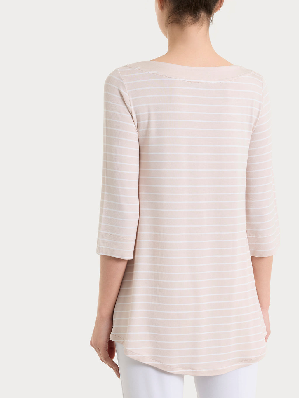 The neckline is finished with a solid-color trim that enhances the neckline, while the 3/4 sleeve completes the design, making the t-shirt ideal for mid-season and warmer days.