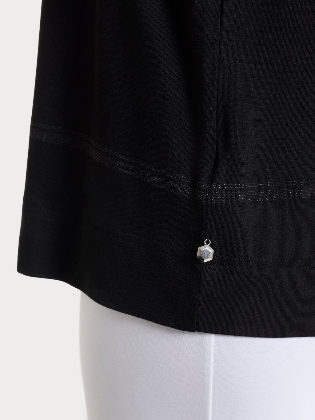 Featuring a double line pattern spaced in lurex, a bright and refined detail that discreetly illuminates the design, adding an elegant touch without sacrificing simplicity.
