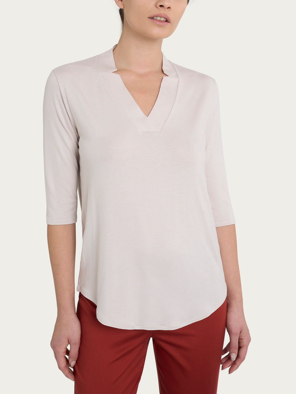 V-neck t-shirt with delicate slits to further define the opening.