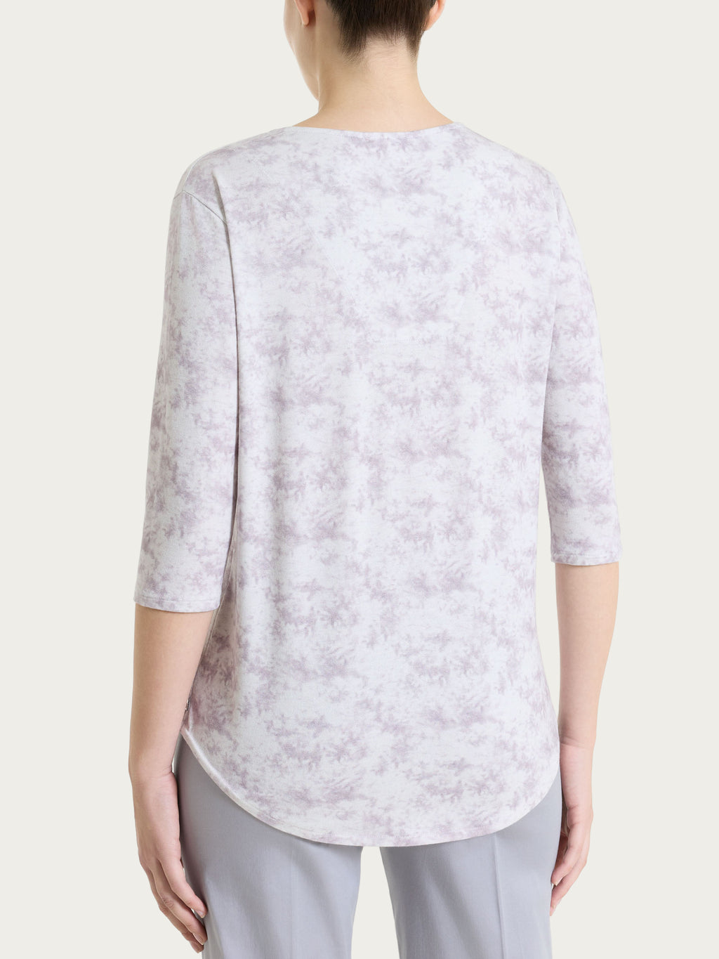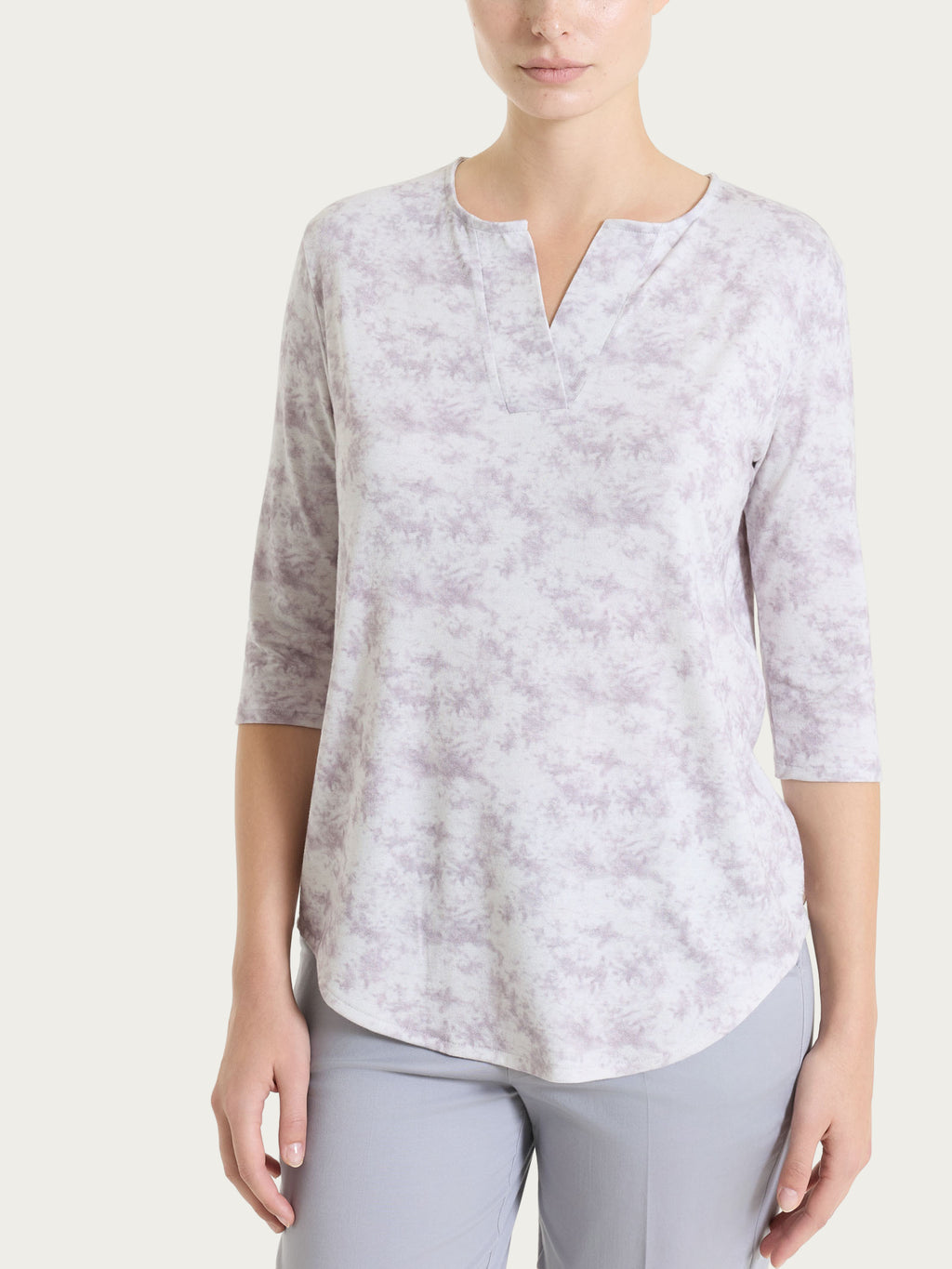 Women's t-shirt with V-neck and 3/4 sleeve, characterized by an all over pattern with watercolor-effect degradé shades, light and harmonious.