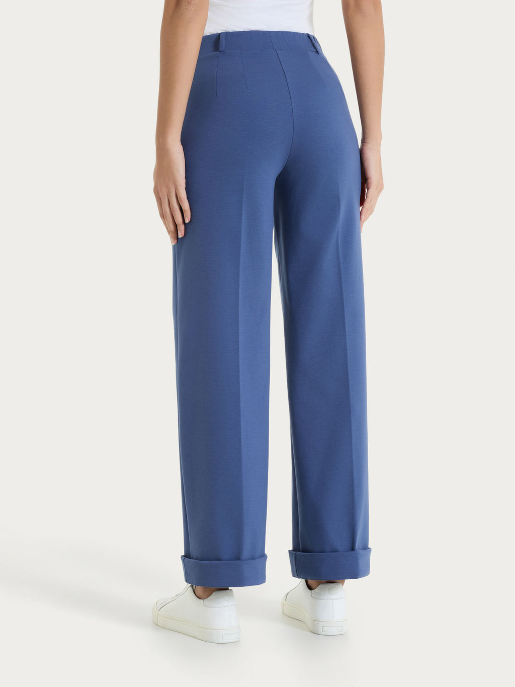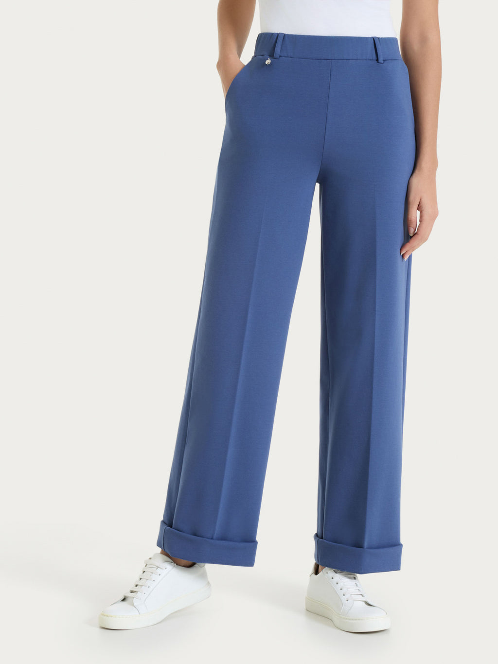 Women's pants with wide-leg pockets and ankle length with turn-ups.