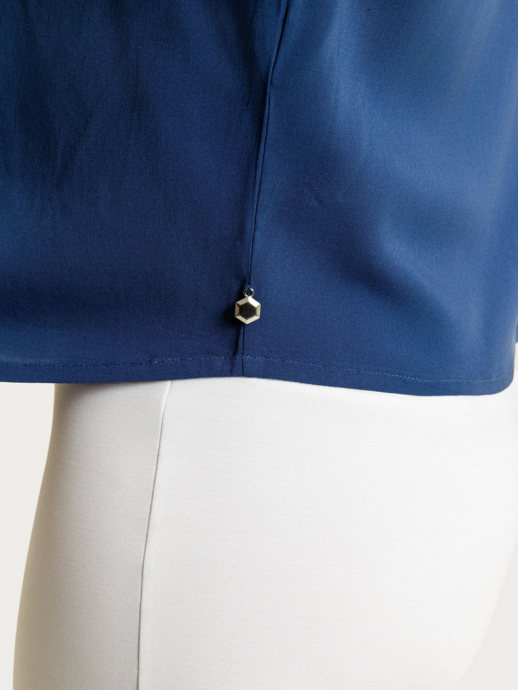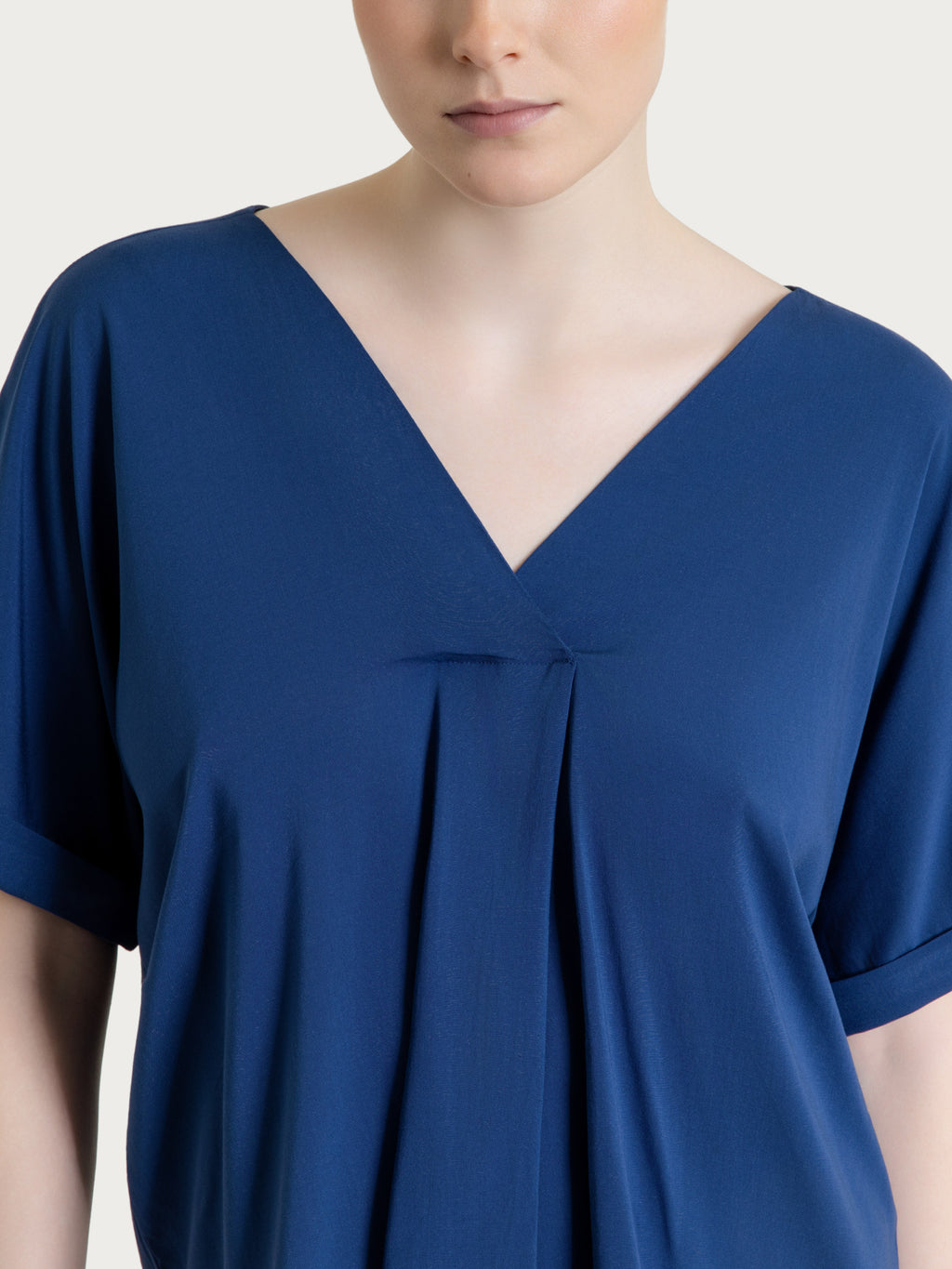 El escote en pico, sin cuello pero con un fondo de pliegues delantero, dibuja una línea limpia que realza el escote, mientras que la manga kimono corta añade un acento contemporáneo y garantiza la máxima libertad de movimiento.