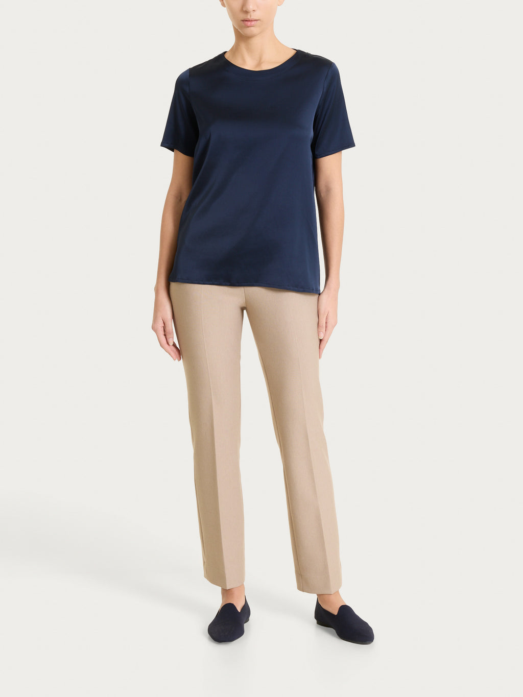 Está confeccionada en Stretch Satin, un tejido ligero de tacto suave y agradable, con un acabado ligeramente brillante que confiere a la prenda un aspecto cuidado. La estructura fluida, enriquecida con un componente elástico, aumenta la comodidad y la libertad de movimiento, al tiempo que mantiene un ajuste estable y pulcro.