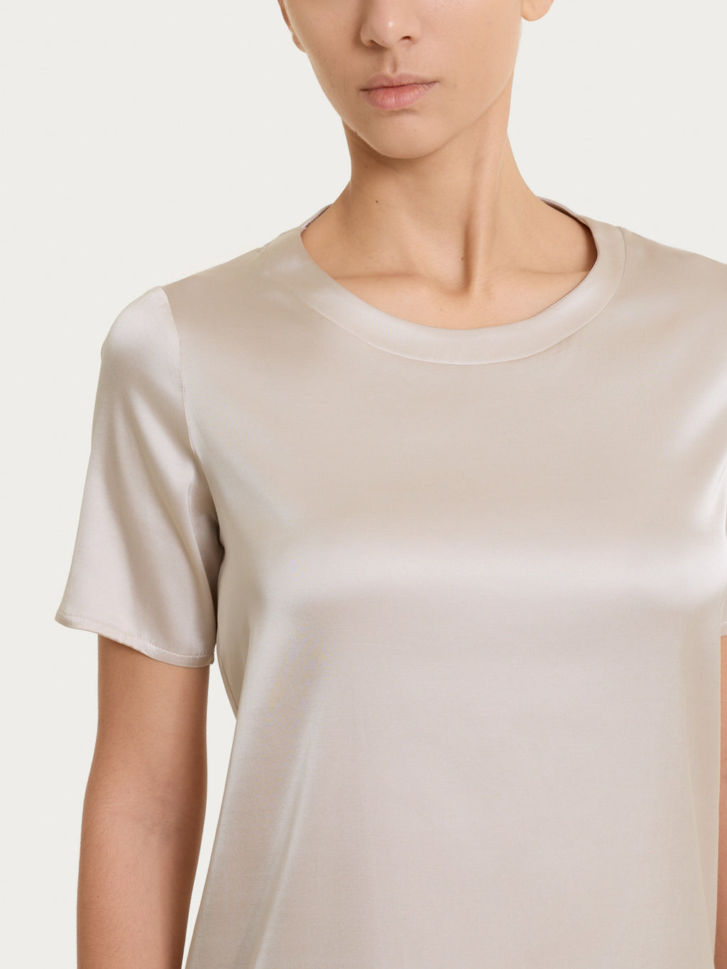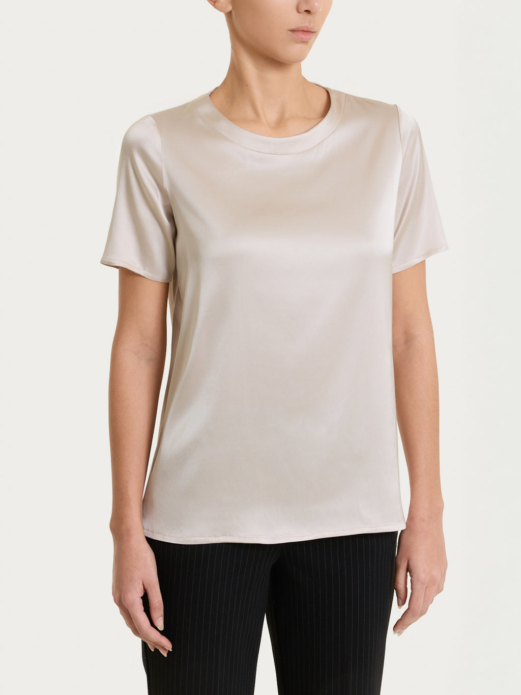 Está confeccionada en Stretch Satin, un tejido ligero de tacto suave y agradable, con un acabado ligeramente brillante que confiere a la prenda un aspecto cuidado. La estructura fluida, enriquecida con un componente elástico, aumenta la comodidad y la libertad de movimiento, al tiempo que mantiene un ajuste estable y pulcro.