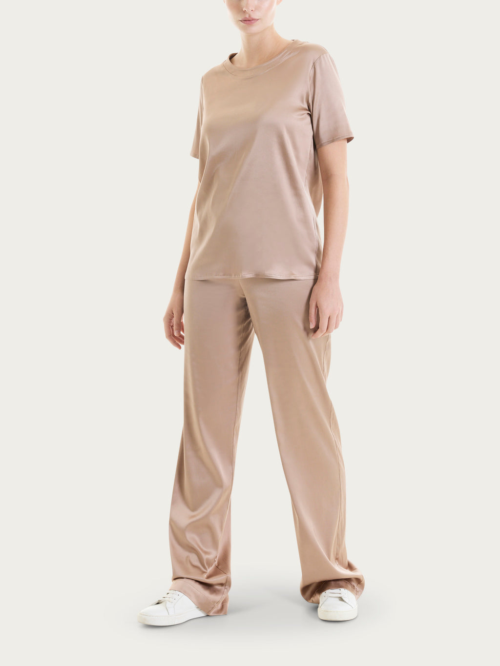 Está confeccionada en Stretch Satin, un tejido ligero de tacto suave y agradable, con un acabado ligeramente brillante que confiere a la prenda un aspecto cuidado. Su estructura fluida, realzada por un componente elástico, mejora la comodidad y la libertad de movimientos, al tiempo que mantiene un ajuste estable y pulcro.